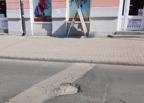 Nagy és mély kátyúk a Gáz utca 2 előtt, életveszélyes sötétben biciklivel, rollerrel.