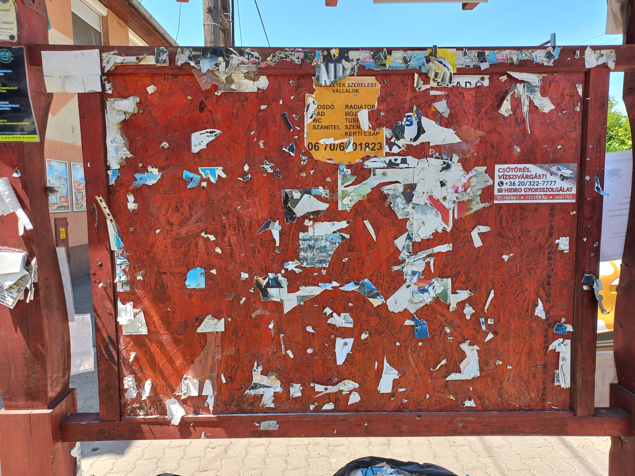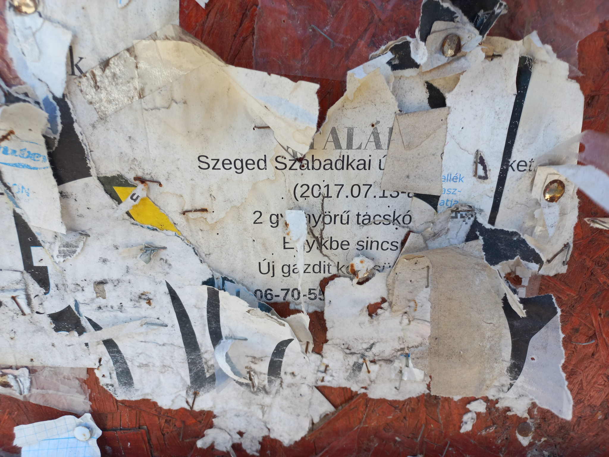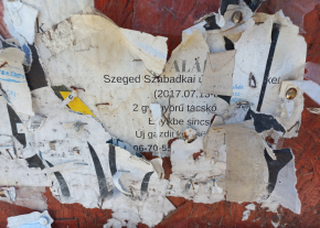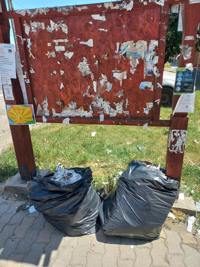 A Szabadkai út 54 szám előtti hirdetőtáblára rendszeresen tesznek ki hirdetéseket, plakátokat, de miután lejár az adott hirdetés ideje, nem veszik le.