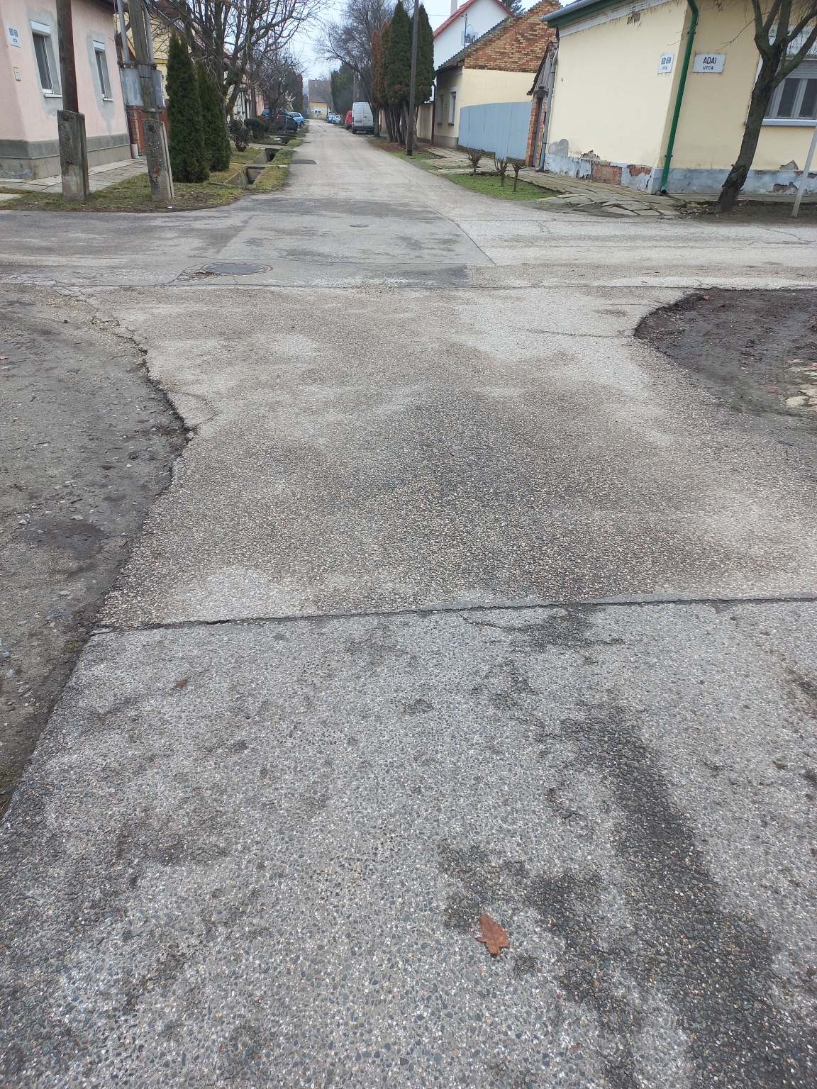 Szegeden, a Cseh Imre tér, Bódi Vera utca és az Adai utca kereszteződésében az aszfalt széle töredezett.