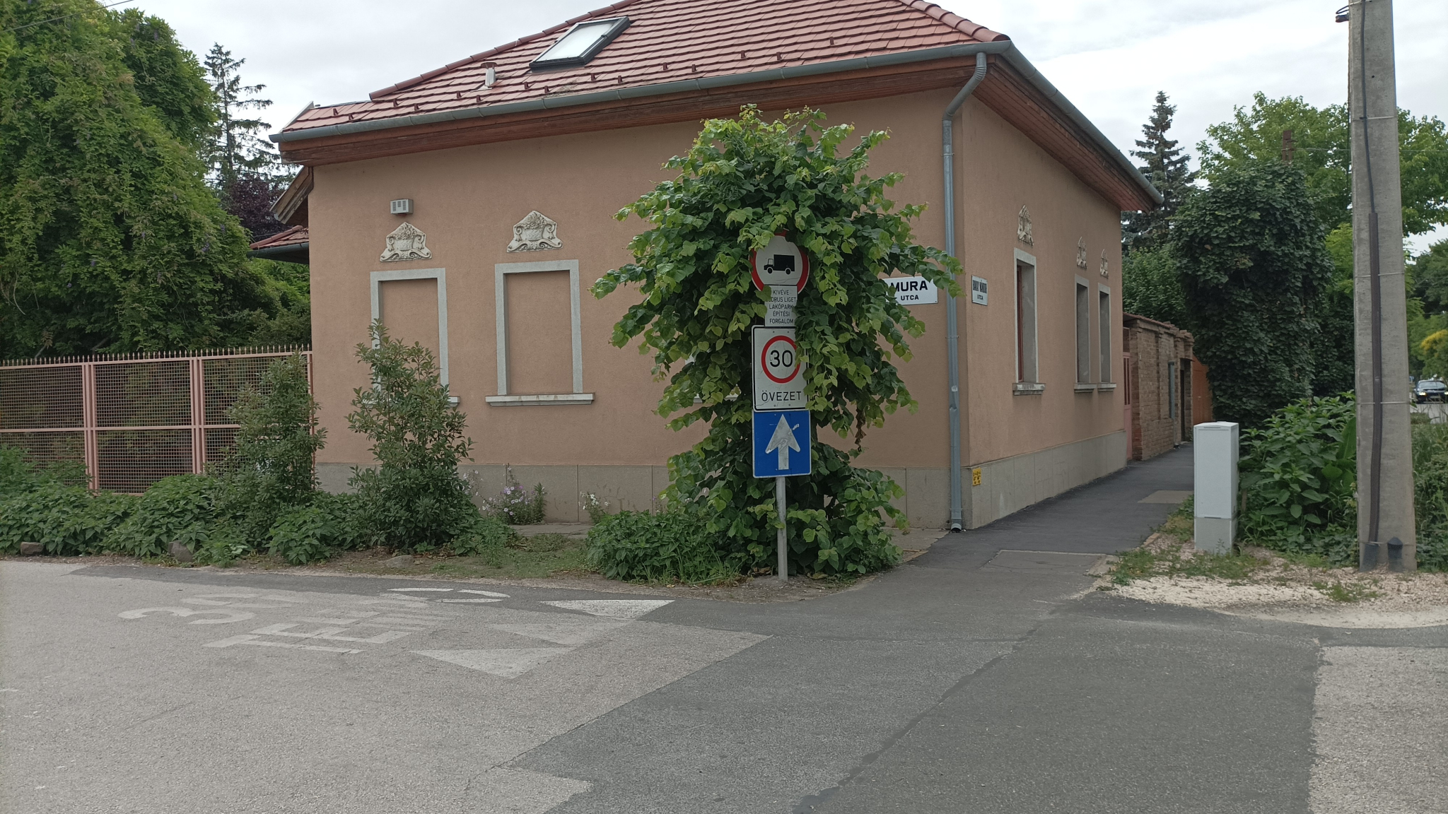A Cédrus liget melletti Mura utca a Bakay Nándor utca felől egyirányú, amit a tábla mutat is a bejáratánál. Mellette van a Cédrus liget aminek garázsából ki-be járnak a kocsik ezen az utcán is a másik vége felőli irányban. Aki a Lajta utcába szeretne menni, lekanyarodhat balra. De egyenesen az egyirányúság miatt már nem mehet tovább a Bakay N. utcára. Ezért ide egy behajtani tilos tábla kell, ami ezt jelzi.