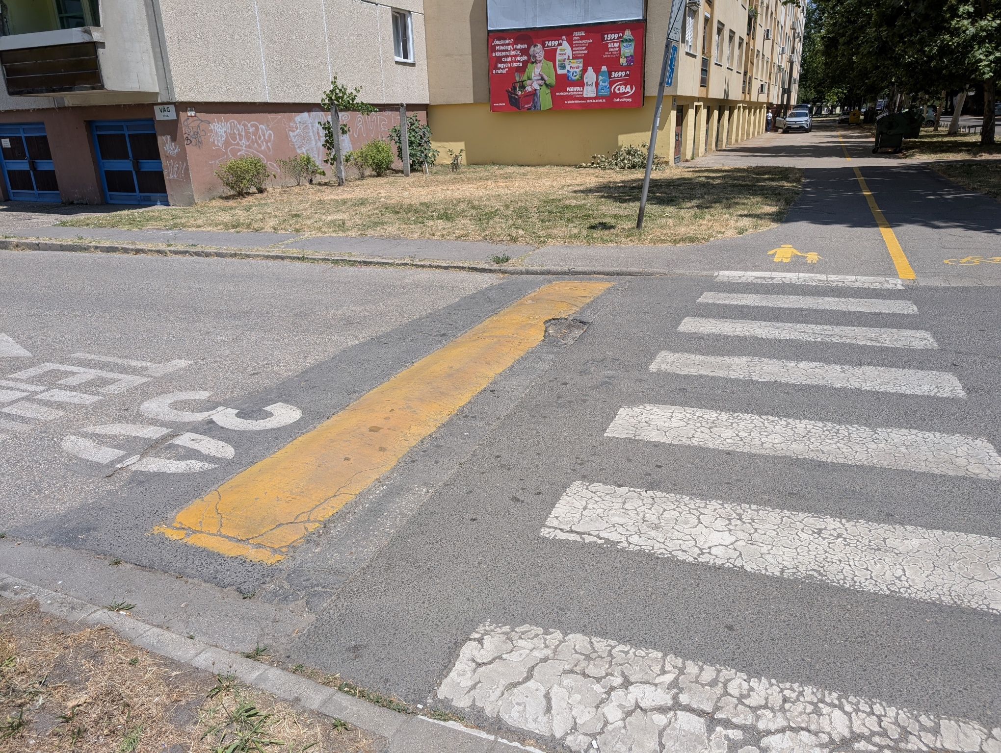 Szegeden a Vág utca 5/A sarkánál a fekvőrendőr anyaga és a mellette lévő aszfalt elkezdett mállani, egy szép kátyút kialakítva. Kérem intézkedjenek a javításról.