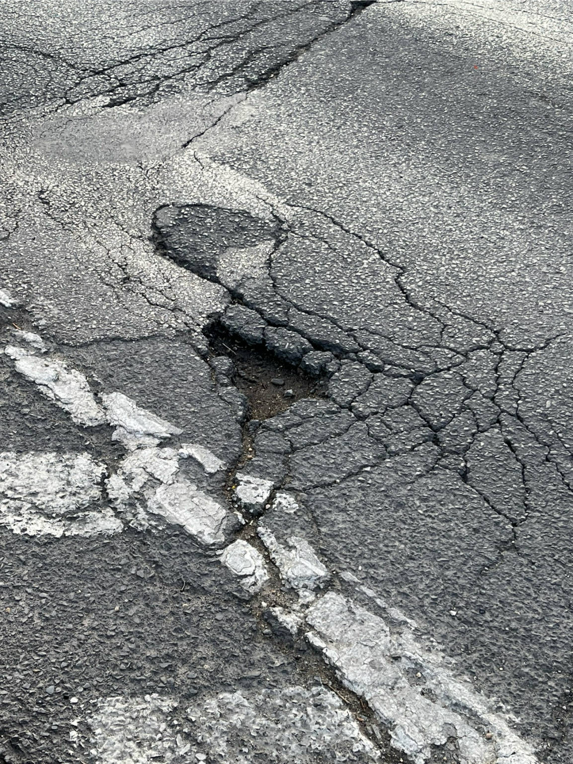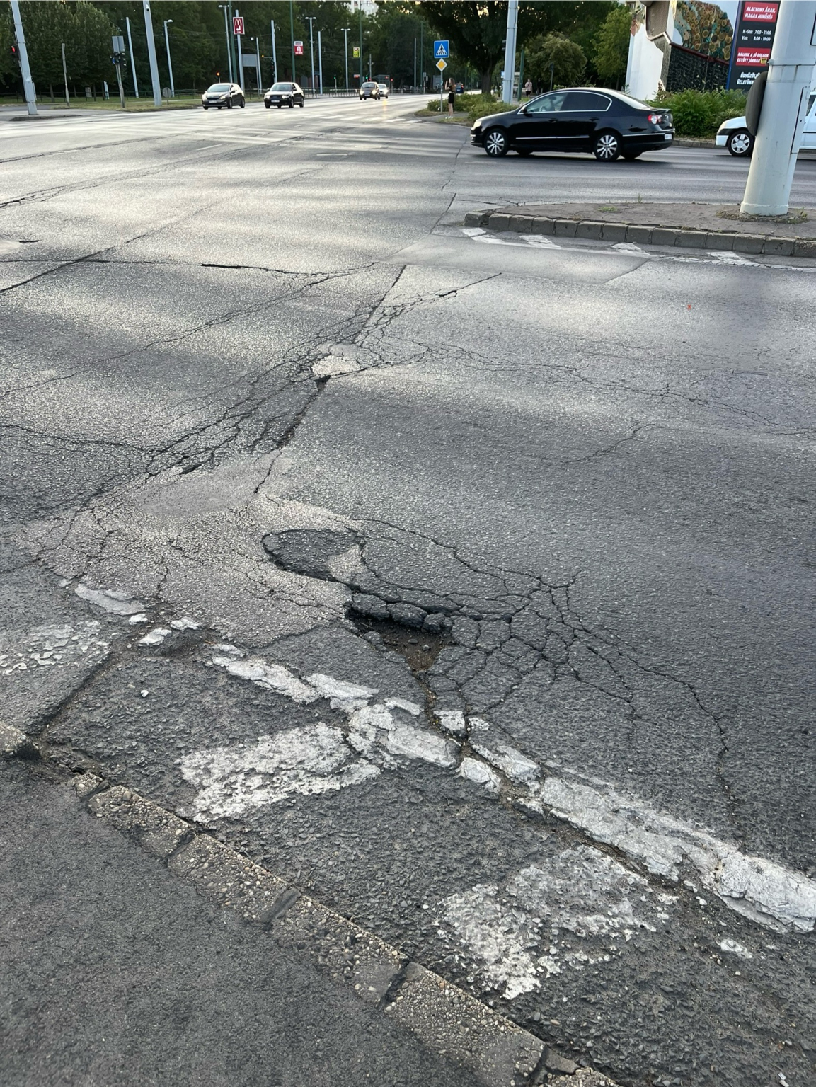 A Makkosházi körút - Csongrádi sugárút találkozásánál a körút déli oldalán a külső sáv külső keréknyomán egy kátyú kezdett el növekedni. A nagy forgalom miatt gyorsan növekszik.