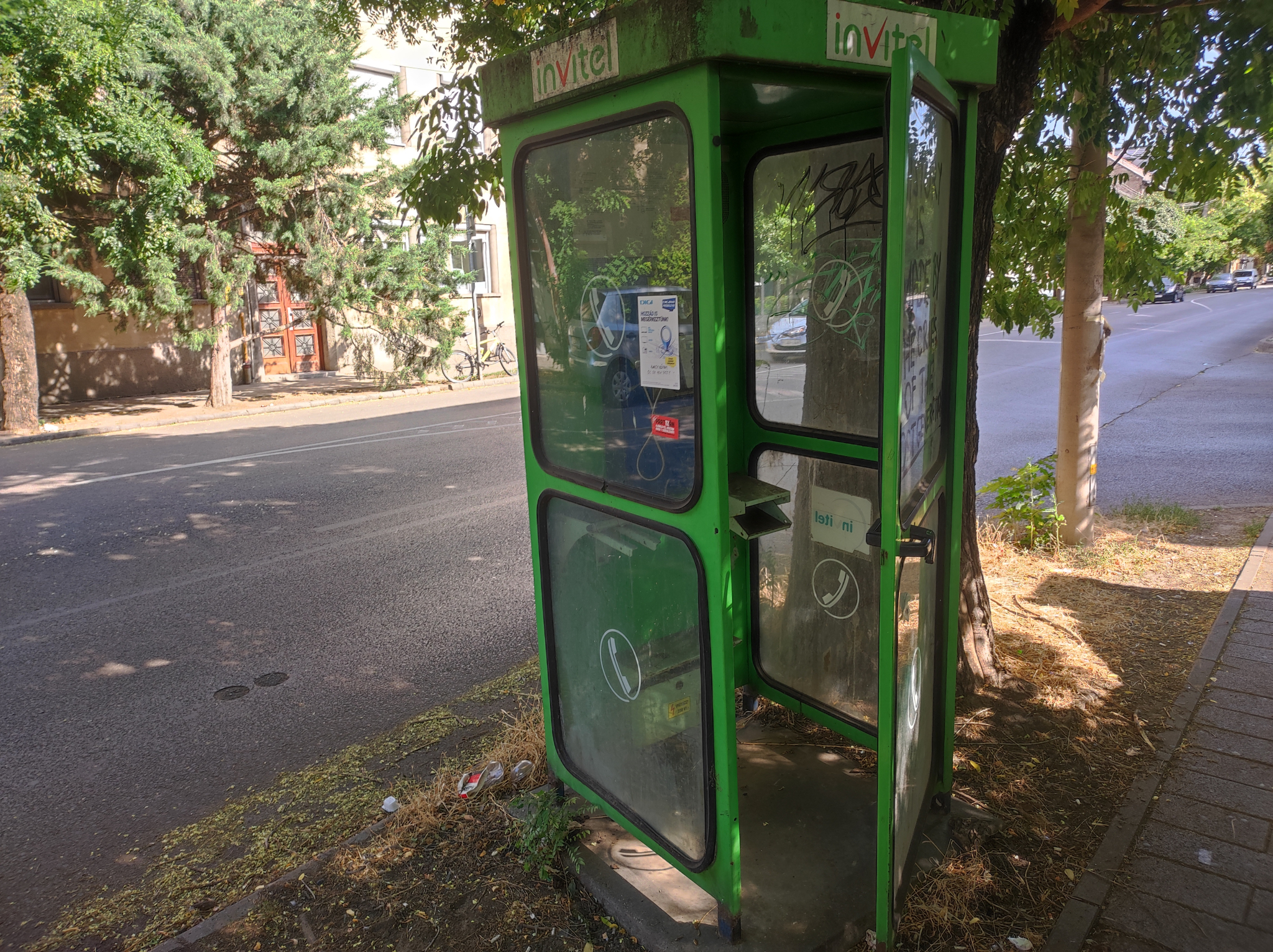 Szegeden a Boross J. utcában az Árkád mélygarázs ki-be járata mellett van ez a mostoha sorsú telefonfülke: rozsdás, el van forgatva, meg van hajolva. Fel kéne újítani vagy megszüntetni.