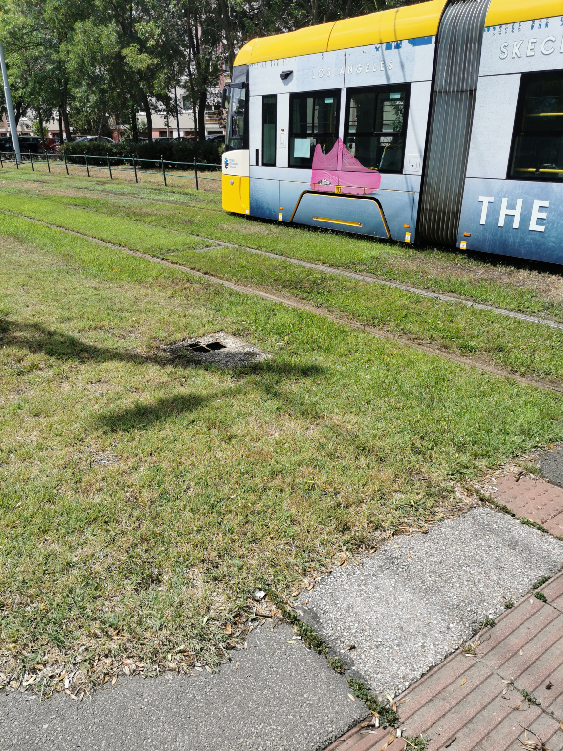 A villamossín melletti füves részen be van szakadva egy aknafedő.