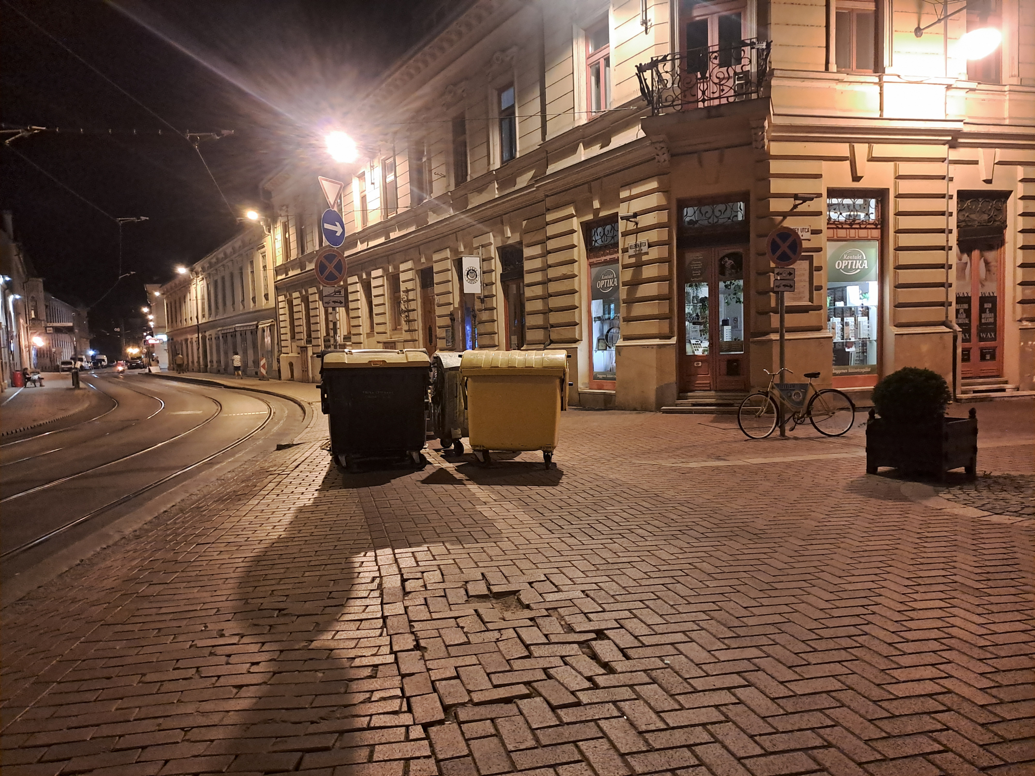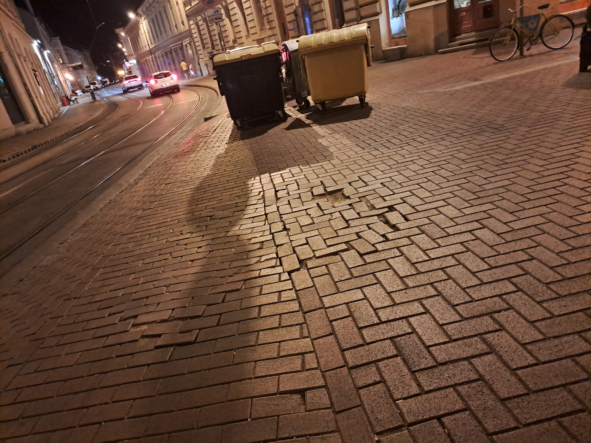 Hiányos és sérült a térkövezés a Kölcsey utca Royal Hotel előtti szakaszán, és a Kelemen László utcai torkolatnál.