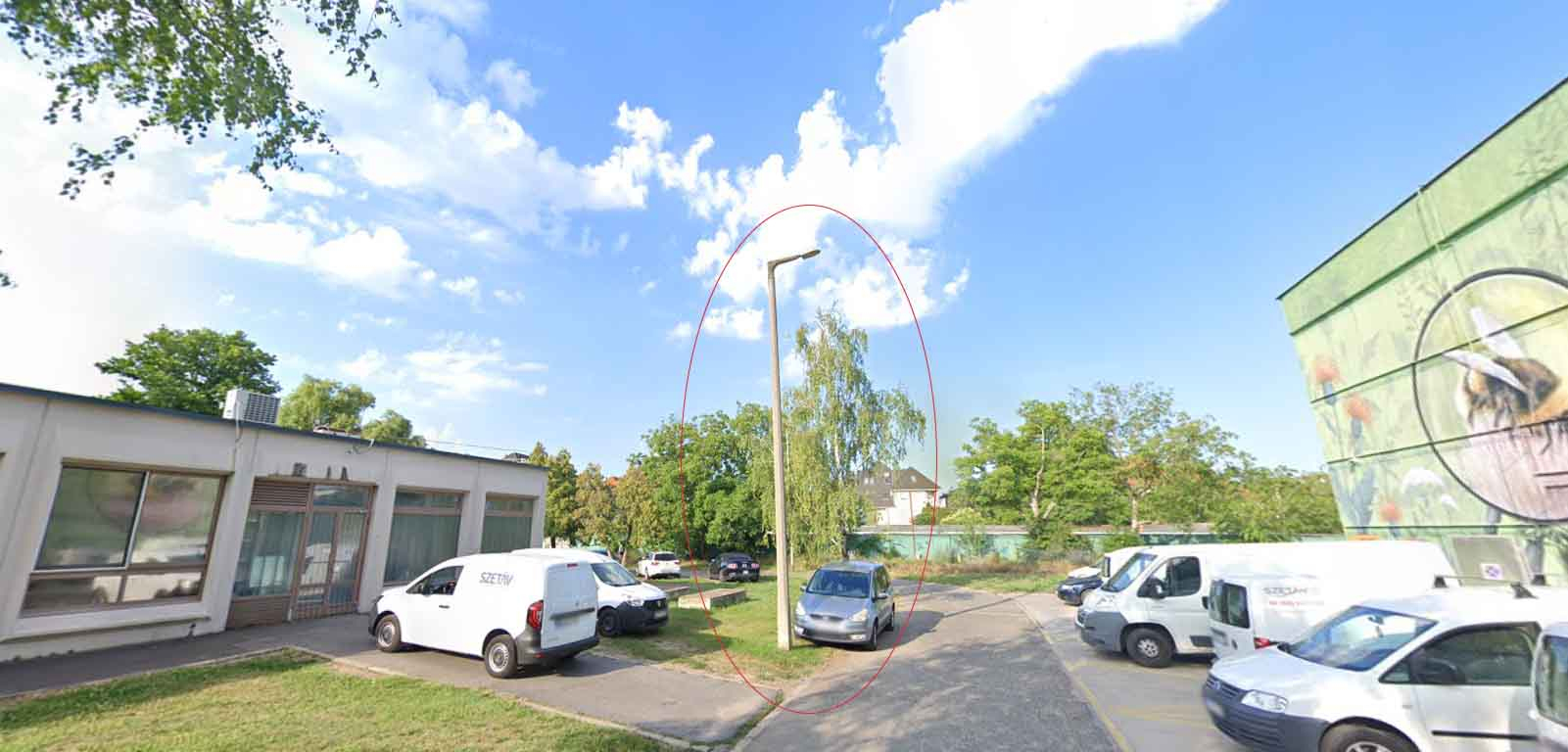 A szegedi távhő épületének parkolójánál, a képen jelzett helyen lévő lámpa újra nem működik. A problémás lámpa a SZETÁV és a fűtőmű között található.