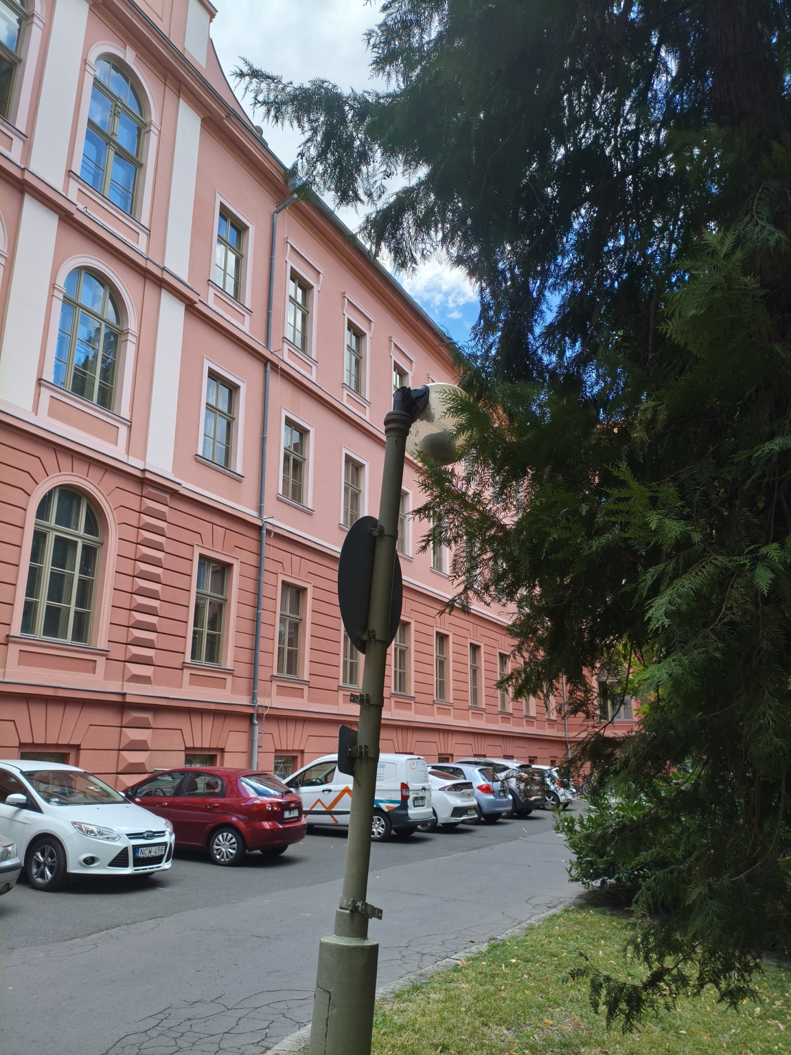 A téren az egyik közvilágítási lámpaoszlopon a lámpatest elentősen elferdült, félő hogy már nem stabil.