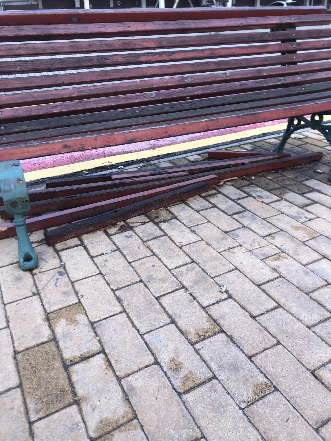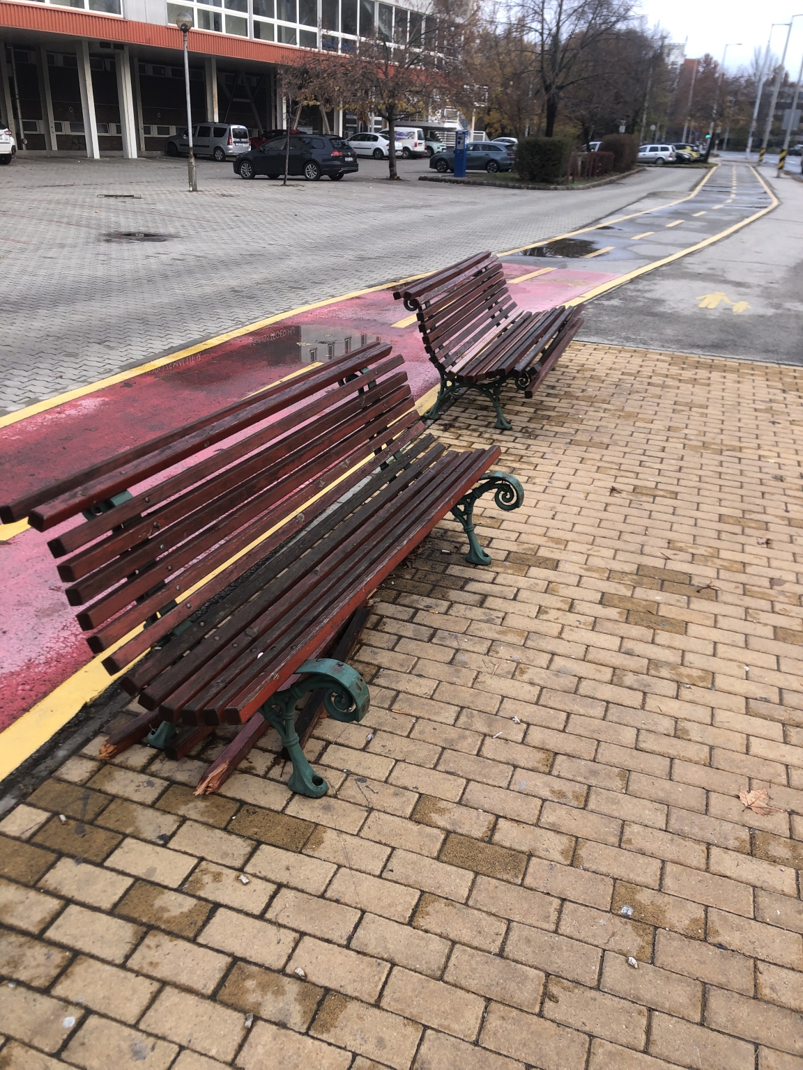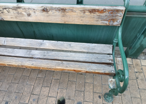 Szeged, Sportcsarnok / Temesvári krt. megállójában található padok sérültek és korhadtak.