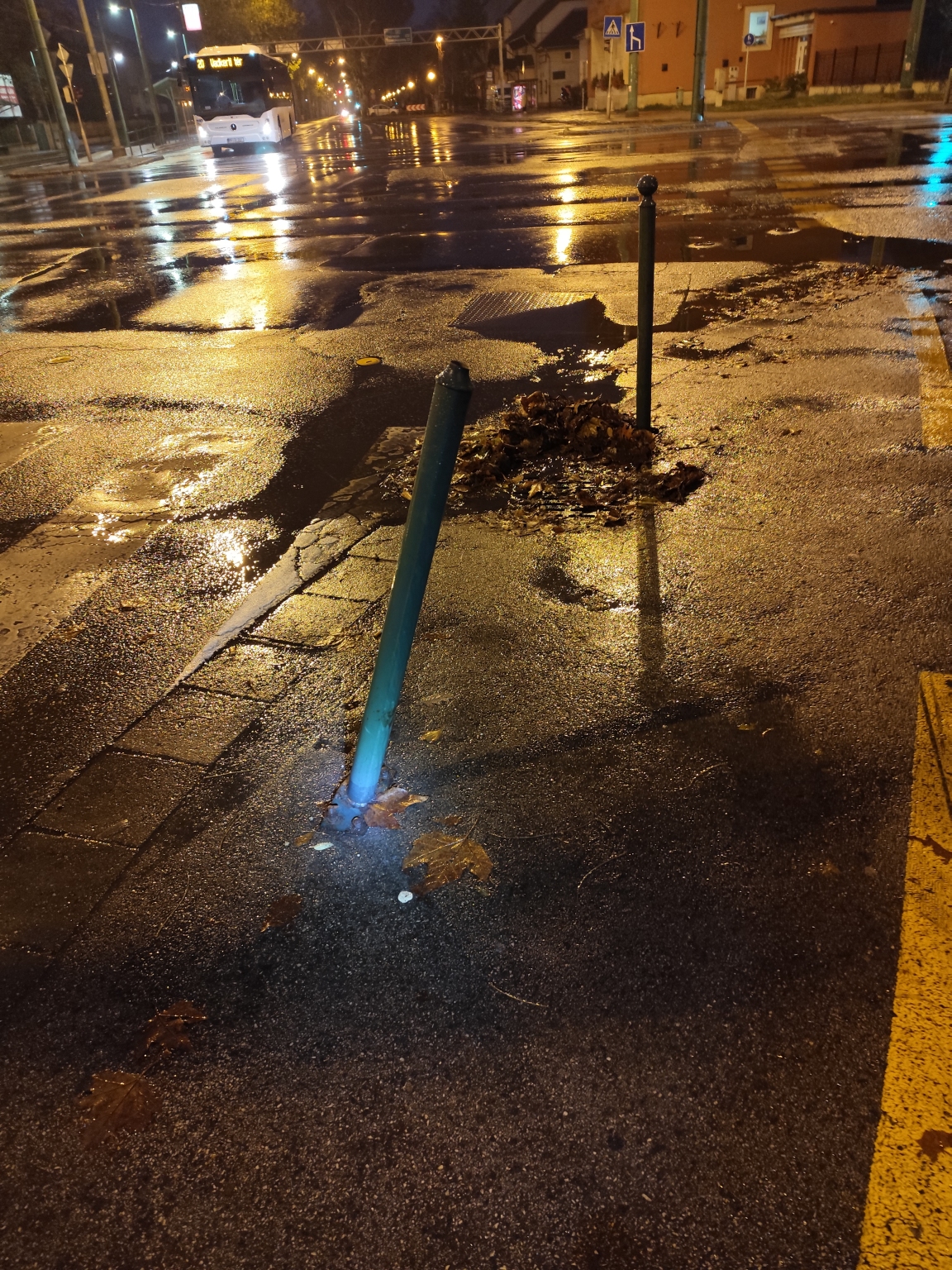 A Római krt és József A. sgt. sarkán, a kisbolt (Sport abc) előtt az egyik poller meg van dőlve és éles a vas pereme a tetején (hiányzik a gömb). Kérem javítsák meg a pollert! Köszönöm!
