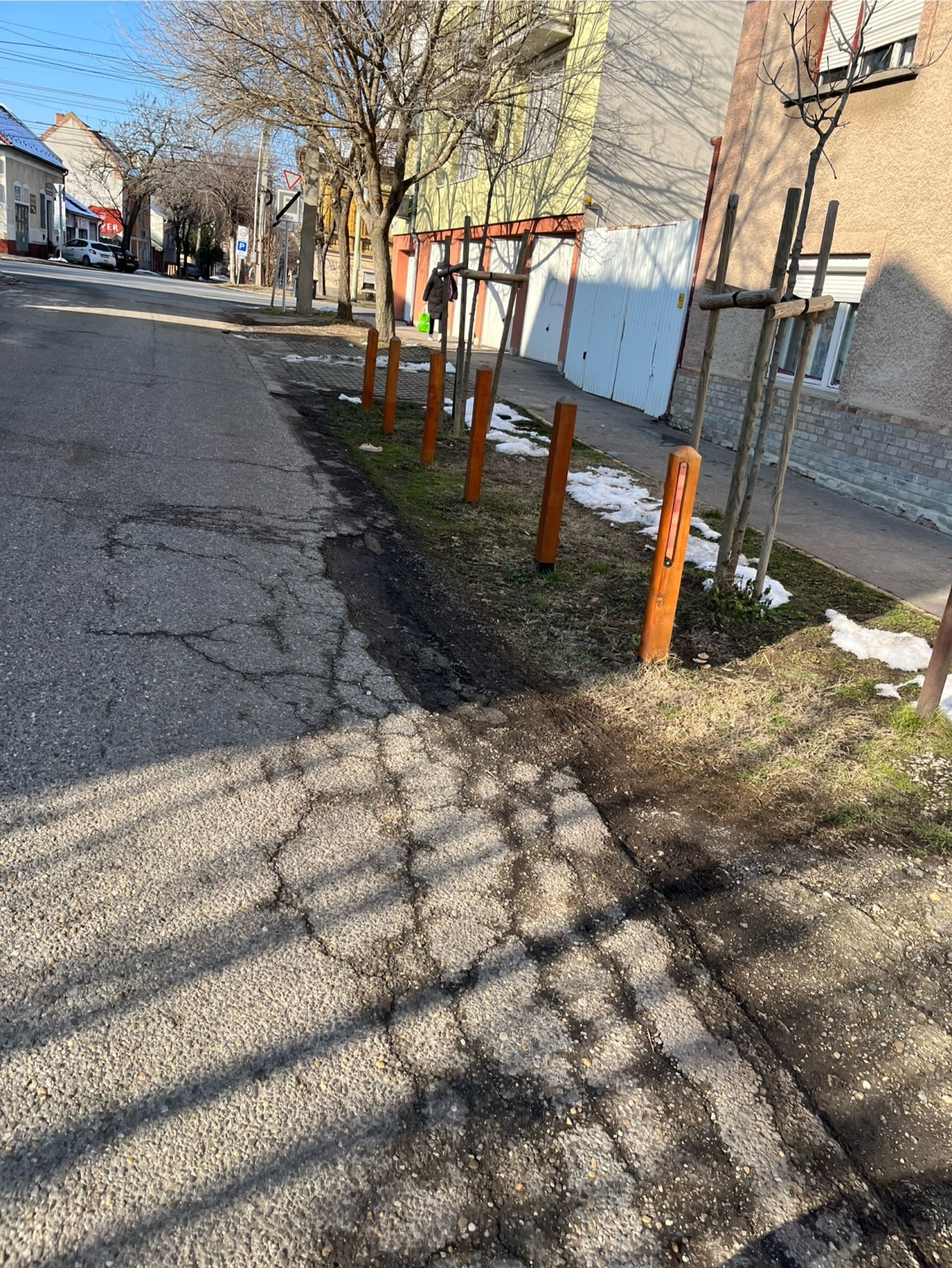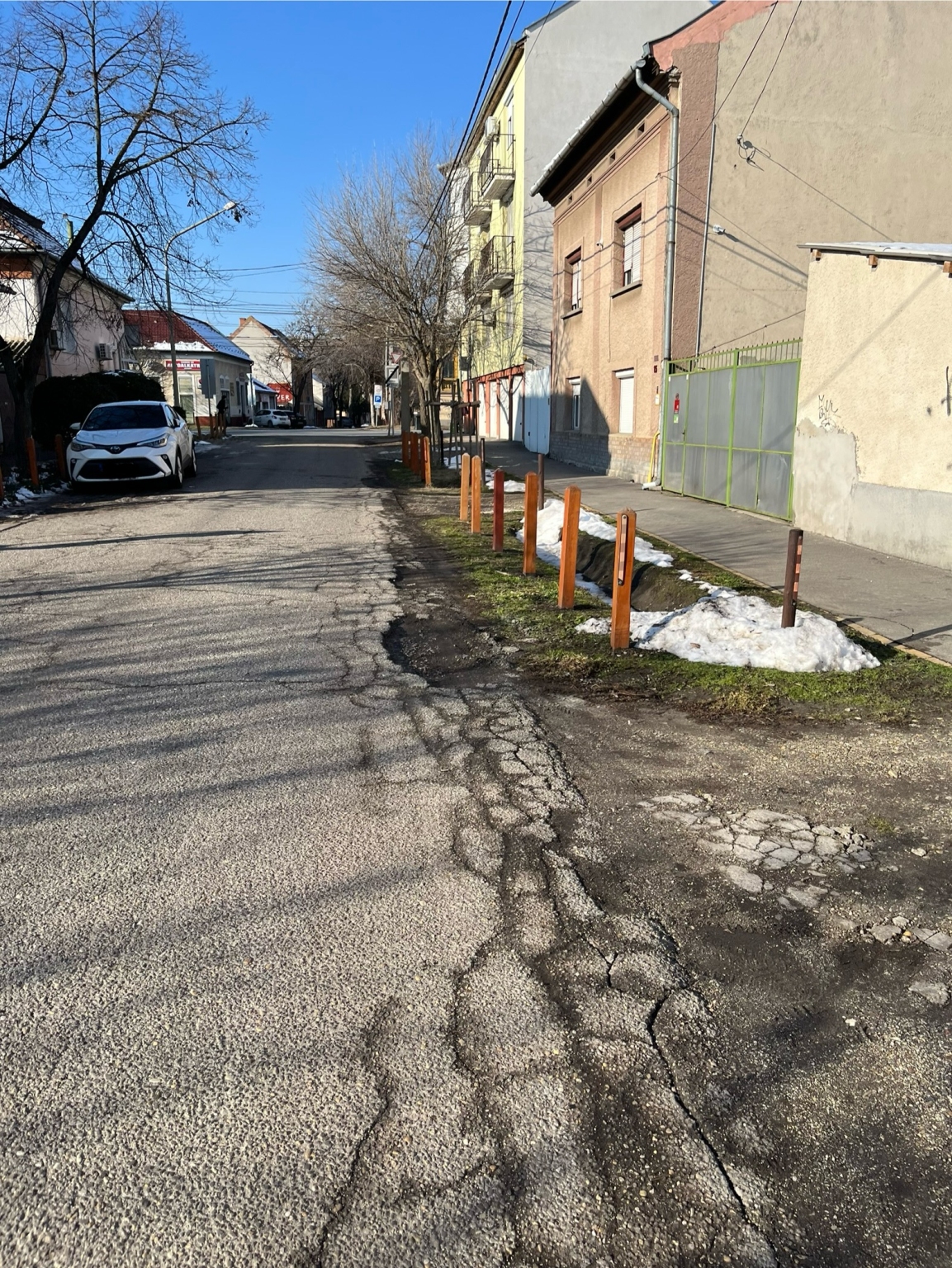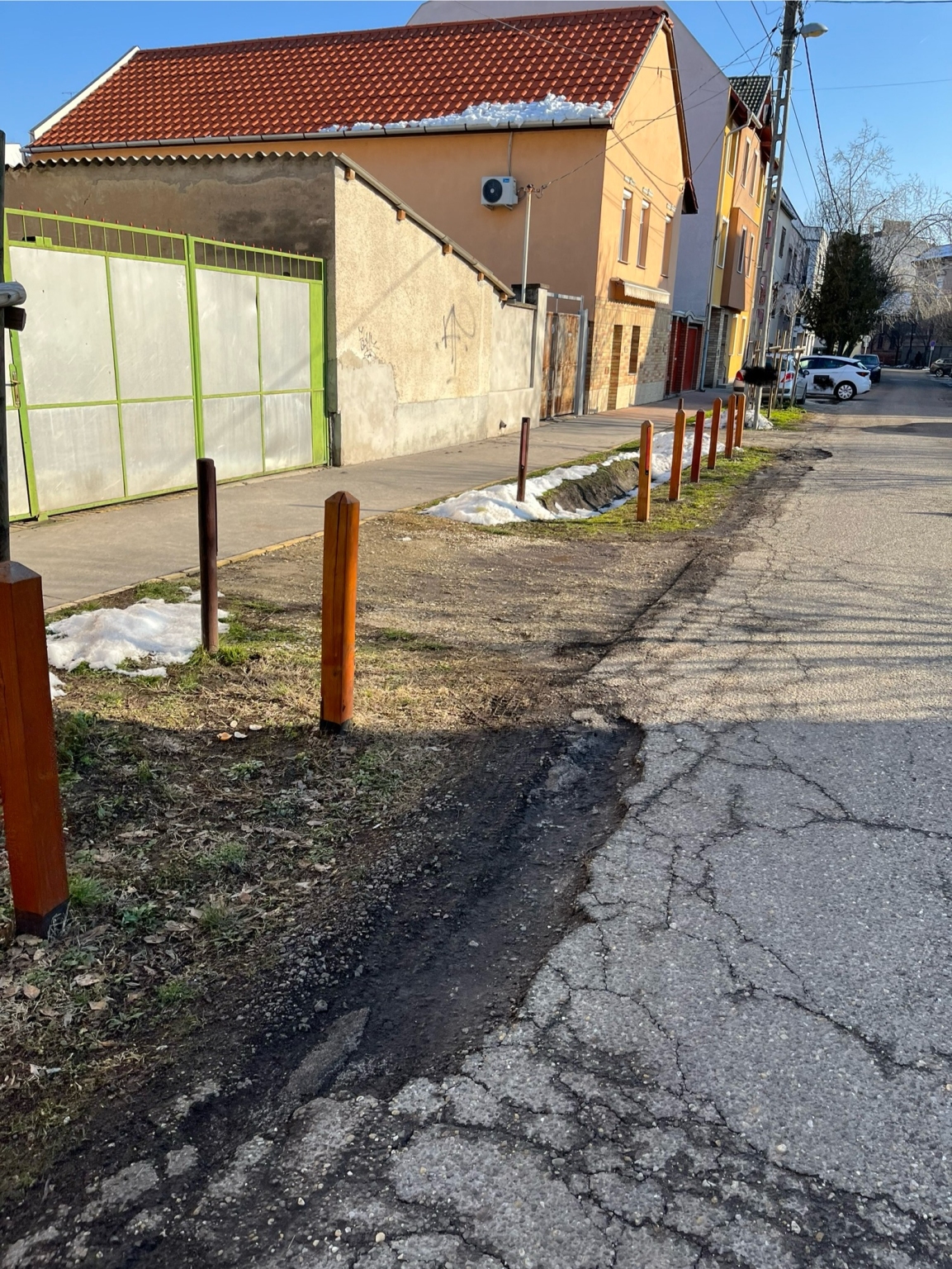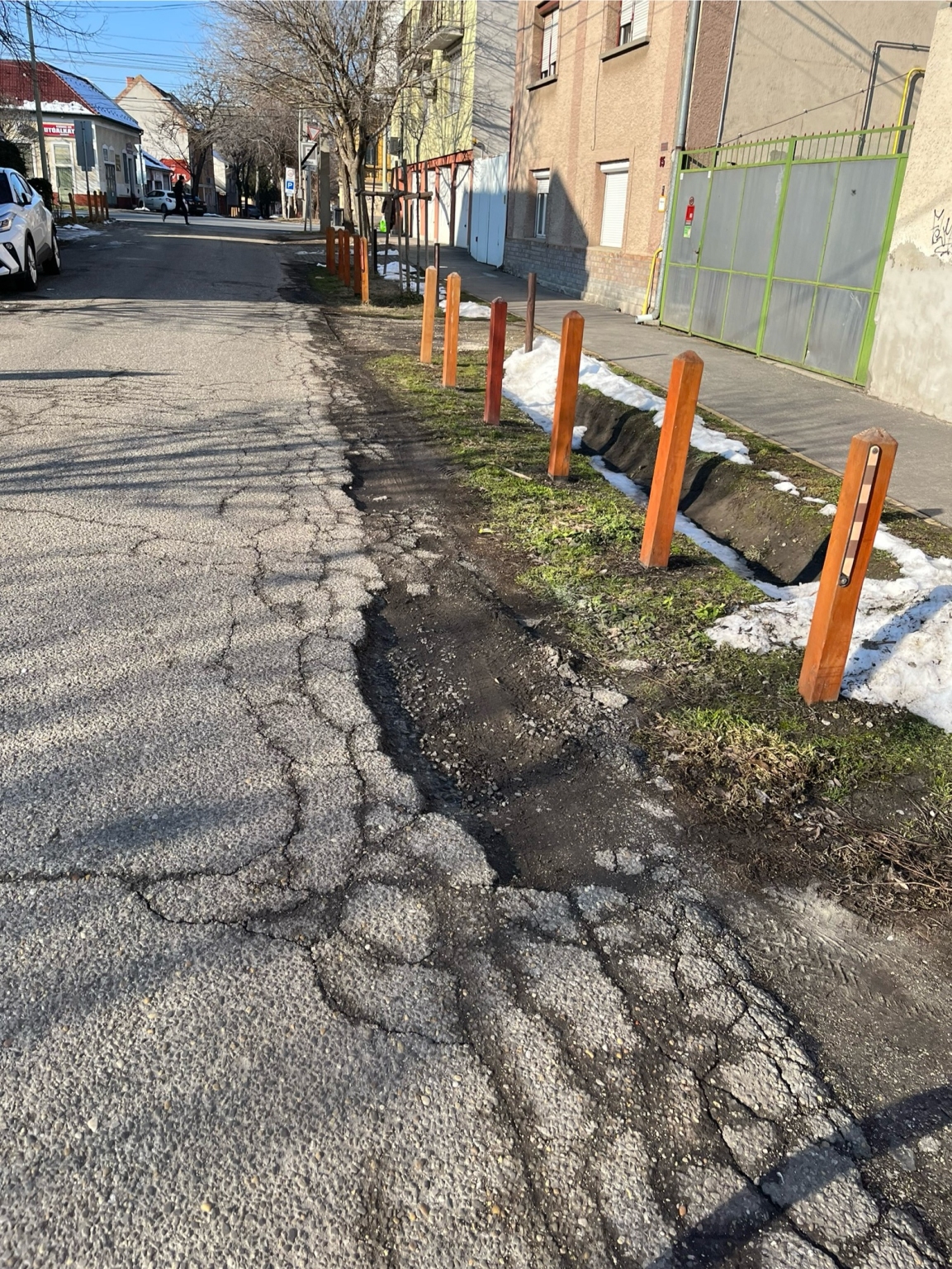 A Gém utca 13-17. szakaszon az úttest széle végig be van repedezve és töredezve, több helyen már akár fél méter szélességben és több méter hosszúságban ki is kátyúsodott. A parkolásgátló karók leverésével együtt akár az úttestet is helyre lehetett volna állítani. Kérjük a teljes érintett szakaszt kijavítani!
