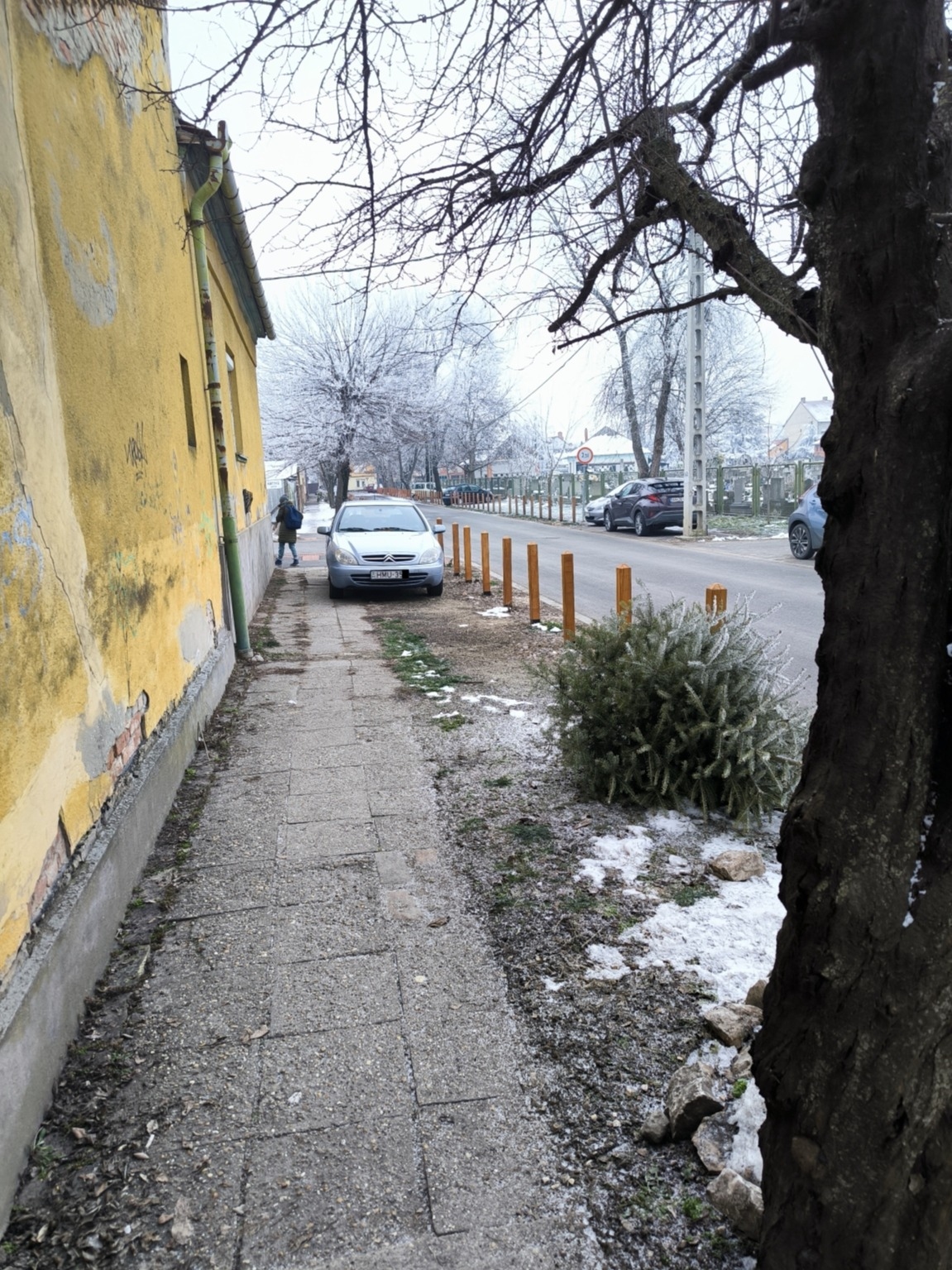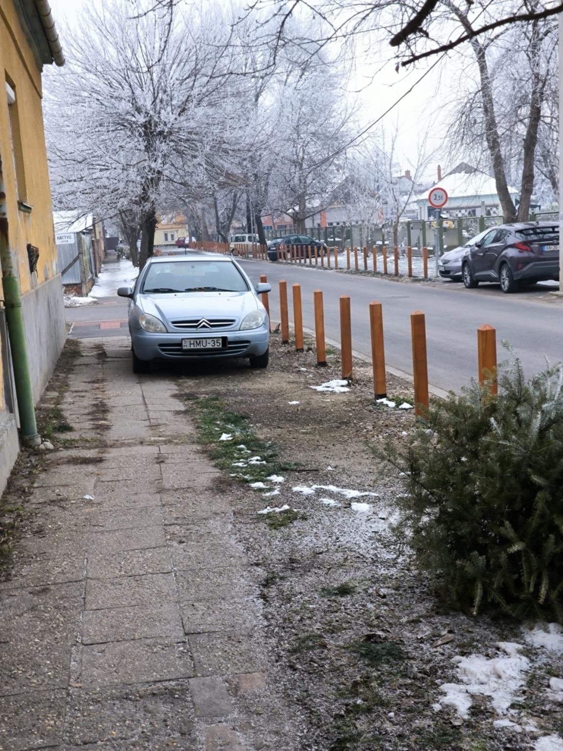 Hattyú utca-Temető utca kereszteződésében a pollerek mögött parkoló autó.