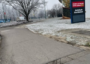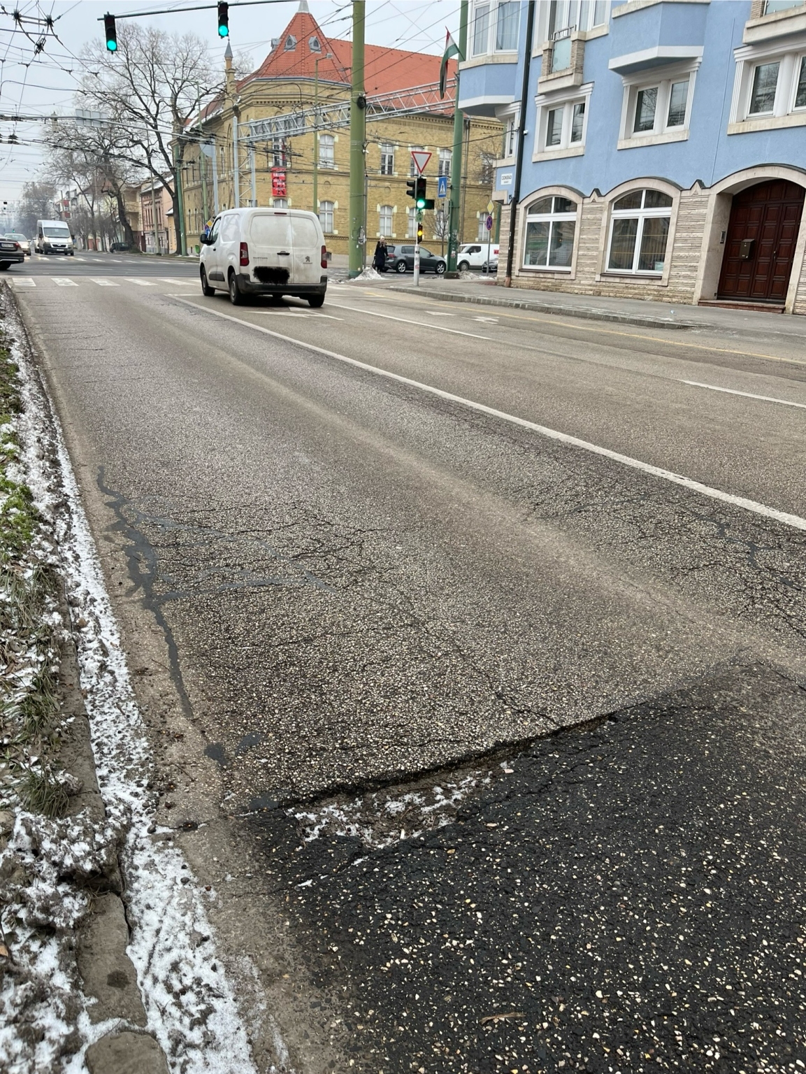 Egyre növekszik a Csongrádi sugárút 14 előtt, egy korábbi rossz minőségű útjavítás szélénél egy kátyú. Nyírja a trolik és az autók futóműveit is.