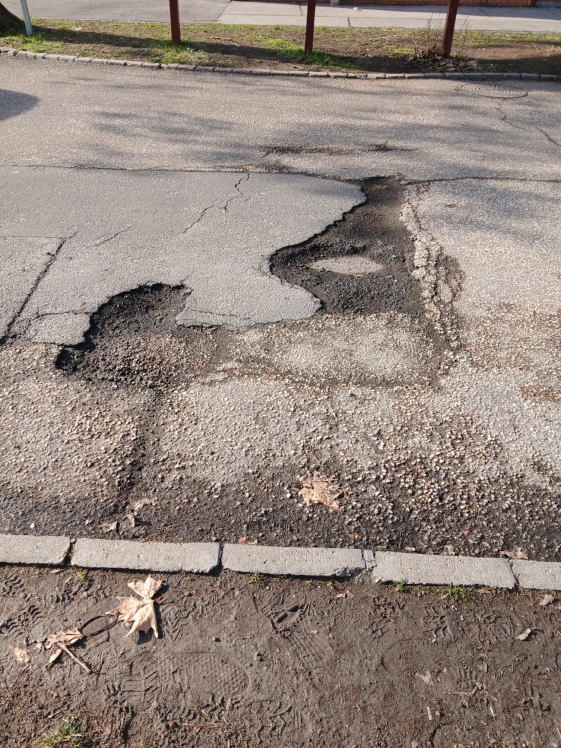 A Budapesti körútról a Weöres Sándor Általános Iskola felé vezető bekötőút kereszteződésében az úttest burkolata több ponton jelentősen megsérült, mély kátyúk alakultak ki, amelyek nemcsak a közlekedés biztonságát veszélyeztetik (balesetveszély), hanem az arra haladó gépjárművek műszaki állapotát is közvetlenül károsítják (futómű- és gumisérülések kockázata).
