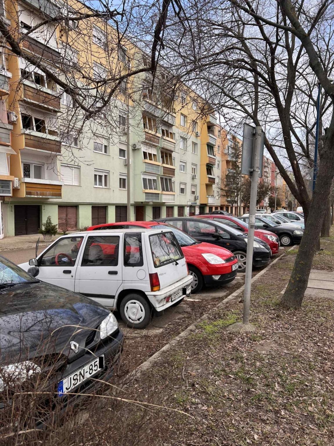 Lejárt műszaki vizsgával parkol egy fehér Daewoo Tico típusú gépjármű GHH-16*-es rendszámmal és foglalja a rokkant parkolóhelyet a lentebb bejelölt helyszínen.