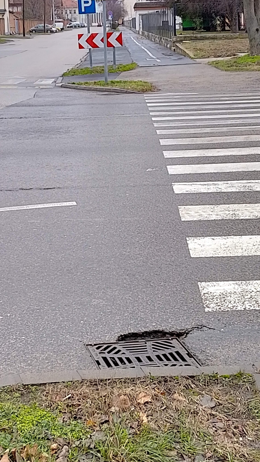 A Vásárhelyi Pál út páratlan odalán, a Pulz utcai kereszteződés közelében (kb. az MVM épületével szemben) a kerékpárút elején a csatornafedél mellett egy jó mély útburkolati repedés alakult ki, a csatornafedő kezd beesni.