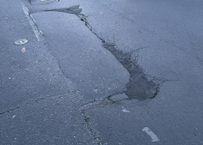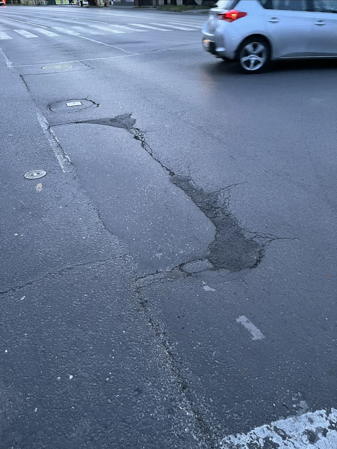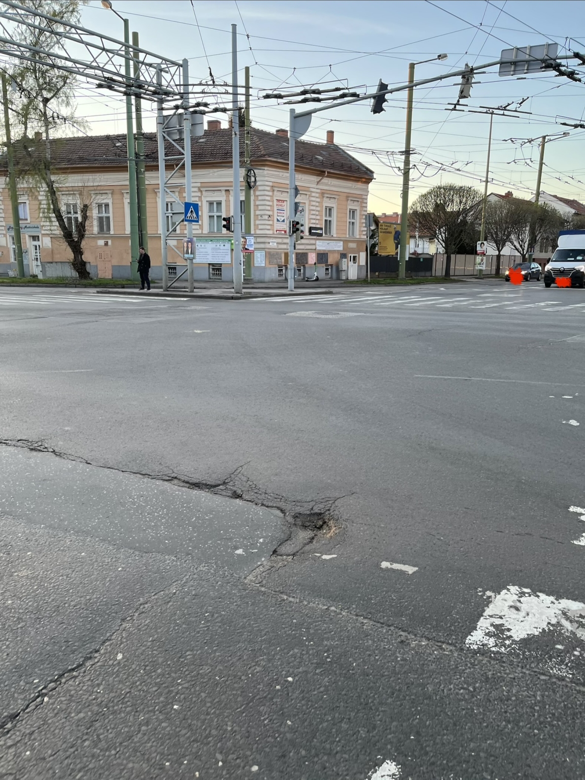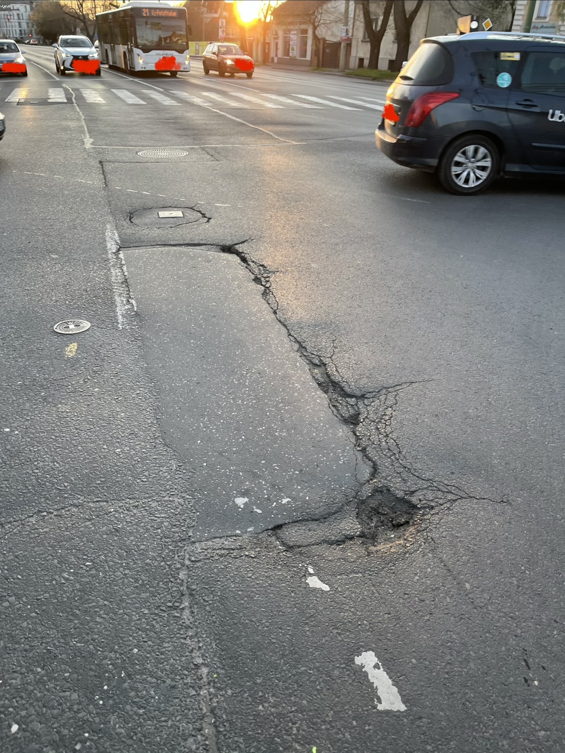 A Csongrádi sugárút - Brüsszeli körút kereszteződésénél, a Bertalan híd felé vezető oldalon hosszabb felületen van egy úthiba, ami elkezdett kátyúsodni. A legnagyobb kátyú épp a keréknyomba esik, pusztítva minden jármű futóművét.