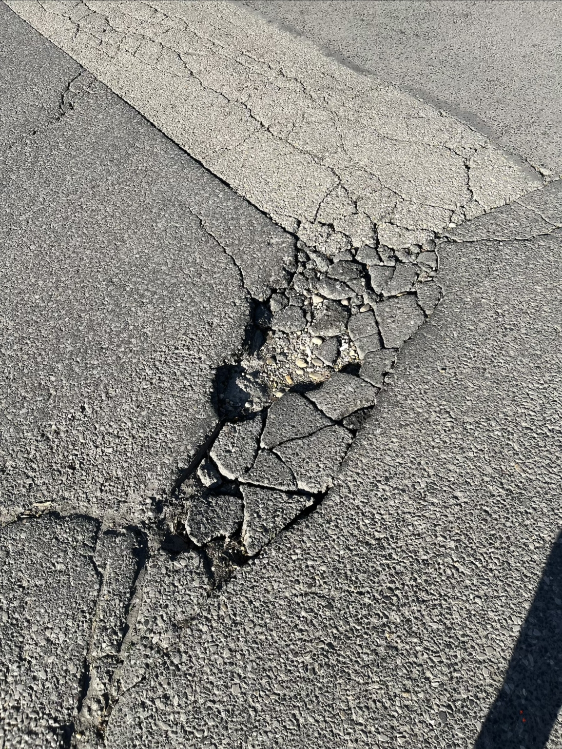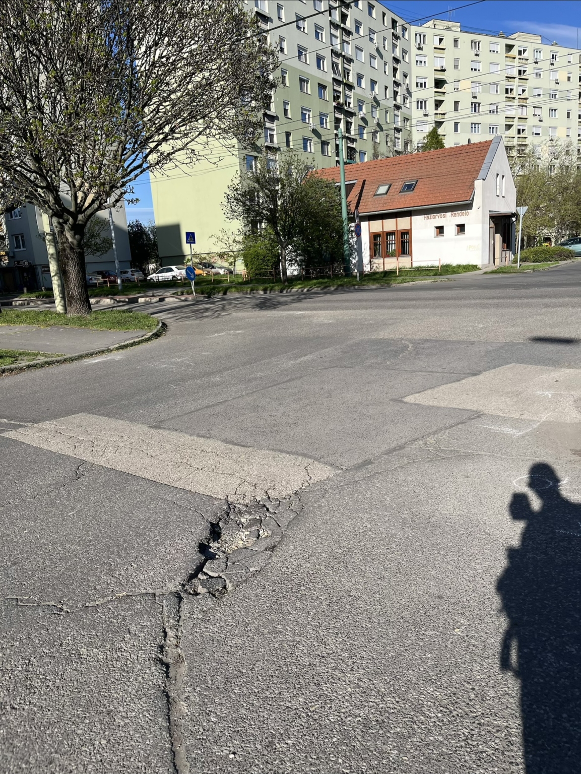 A Gyöngyvirág utca 14. előtti parkoló Ortutay utcai kijáratánál megint kátyúsodni kezdett az út. Elég nagy felületen szét van töredezve, csak idő kérdése, hogy a mostaninál is nagyobb legyen.