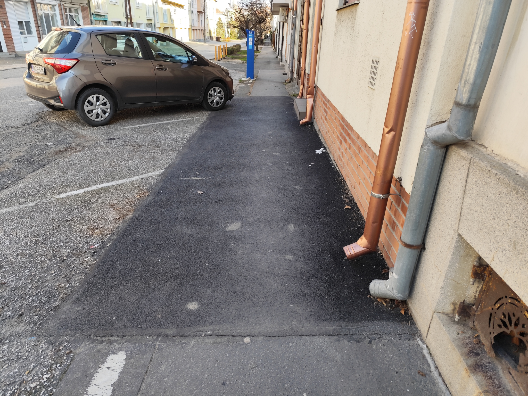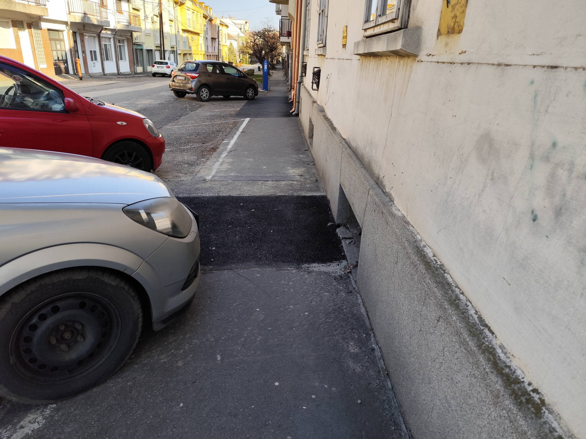 Megsüllyedt az aszfalt és botlásveszélyessé vált a járda, ezért kérem az illetékes szakembereket, hogy javítsák meg a járdát!