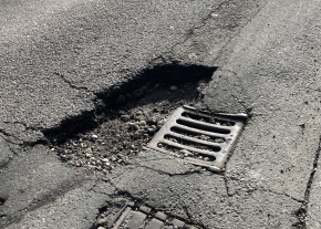 Óriási kátyú a benzinkút kijáratánál