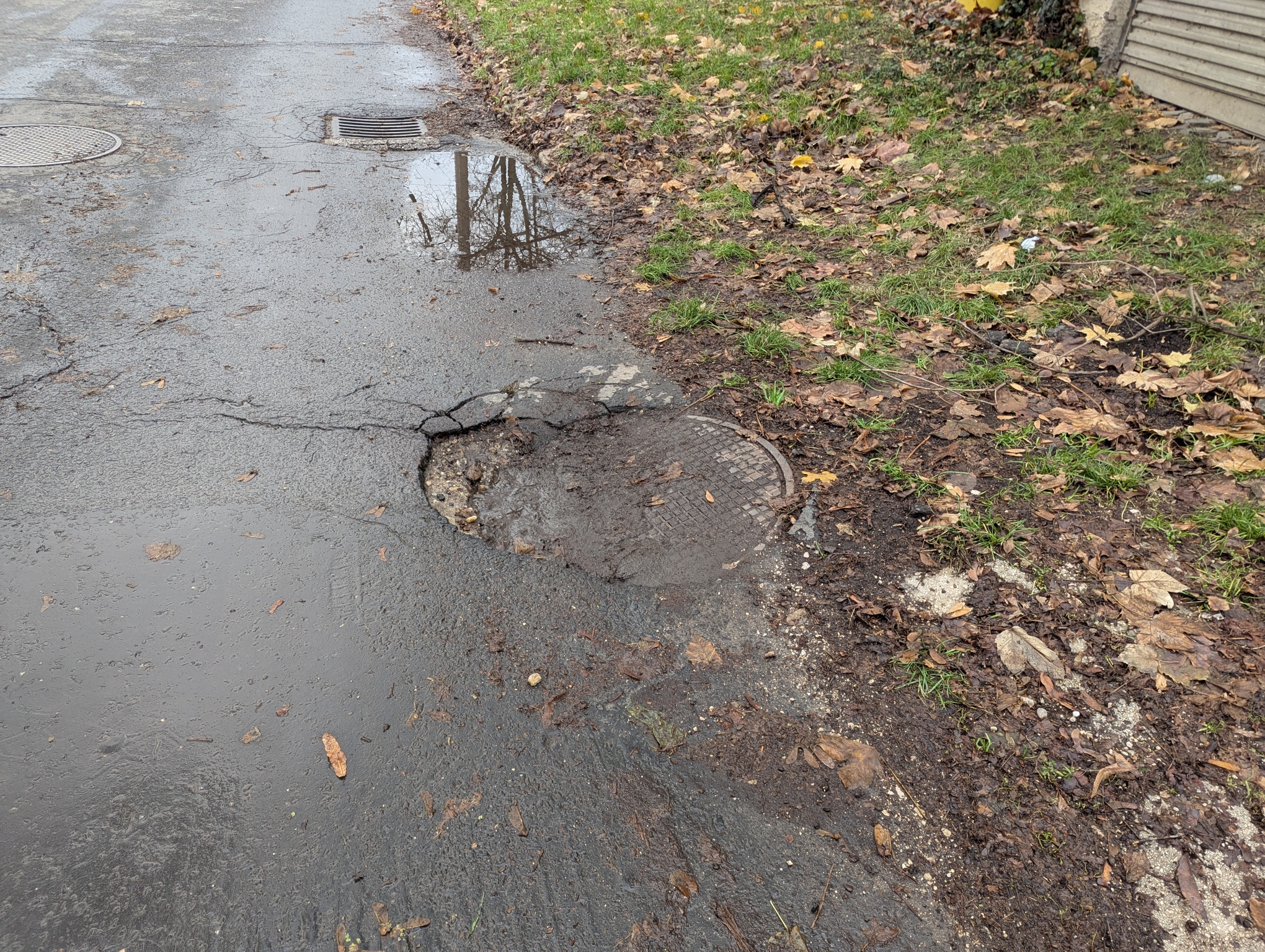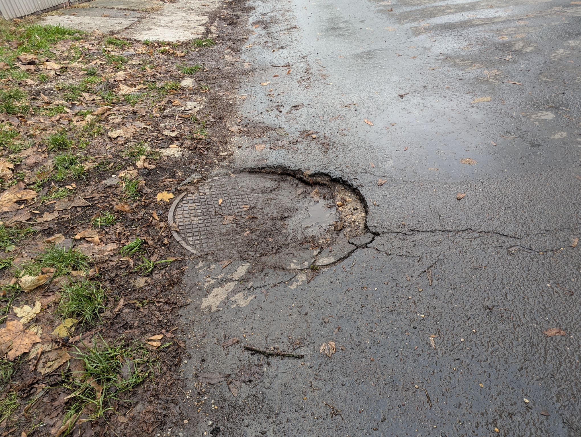 A lakótelepre bevezető, forgalmas úton pár napja elkezdett egyre jobban megsüllyedni az egyik aknafedél.