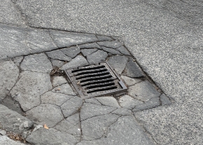 A Jobbágy u.4. előtt a csapadékvíz kimosta az aszfaltot a csatornaszem körül.