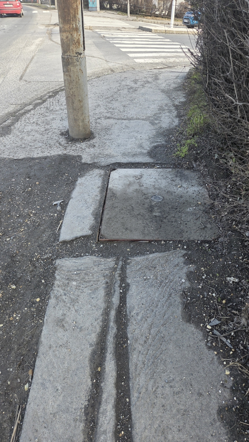 Átlyukadt a betonlap a gyalogos átkelőhely elött.