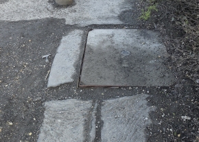 1 sz. főút 20+640 jobb szelvényben, járdában található szerelvényakna