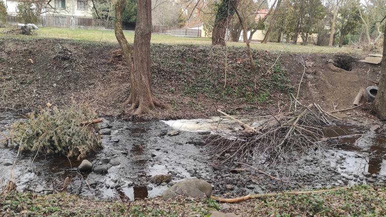 A Bükkös-patak ezen szakasza szemetes, a patakban egy karácsonyfa és bedőlt ágak találhatóak.
