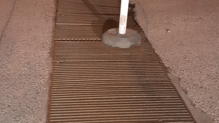 A fotón látható beszakadt esővízgyűjtő fedőrácsát 3 hónapja lebólyázták és slussz. 3 hónapja!