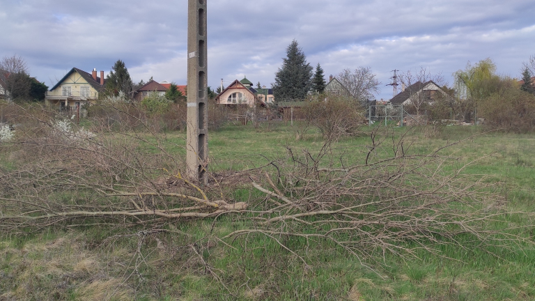 A villanyoszlop körül az illetékesek kivágták a bokrot, majd a helyszínen hagyták az ágakat.