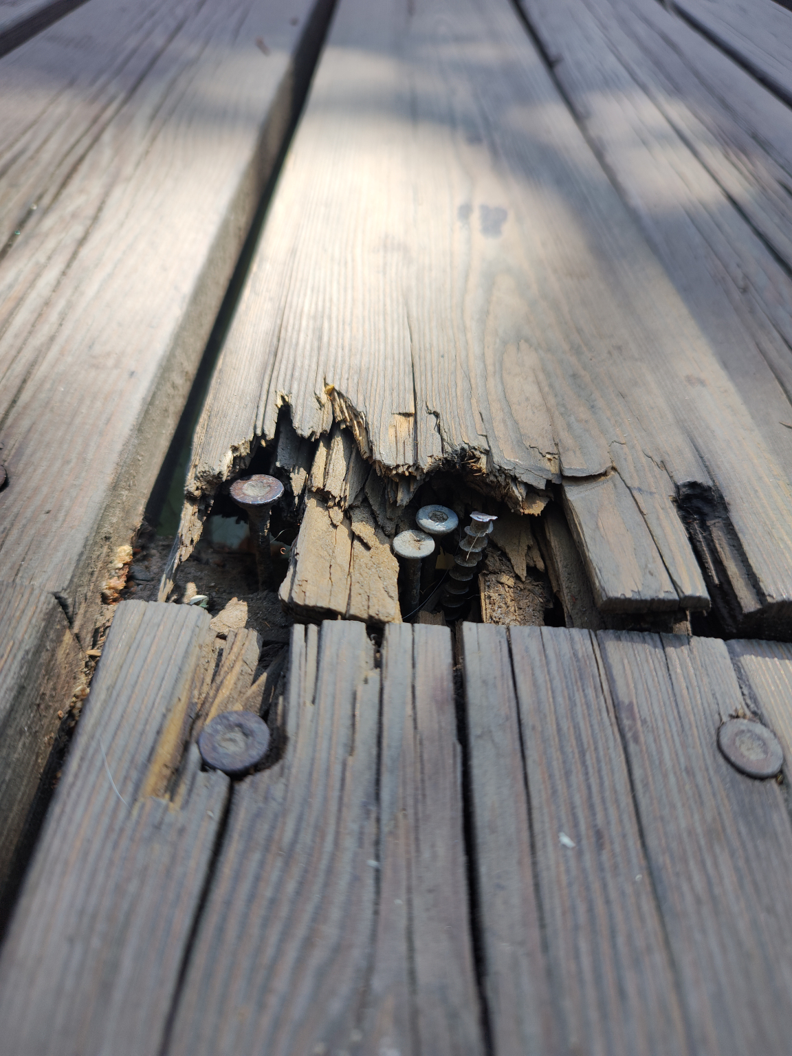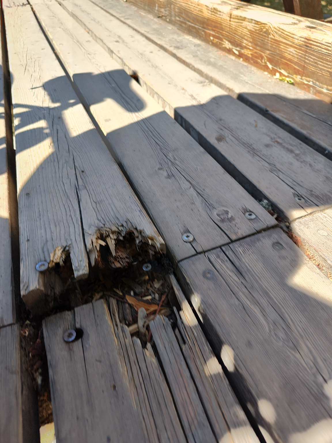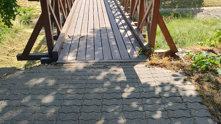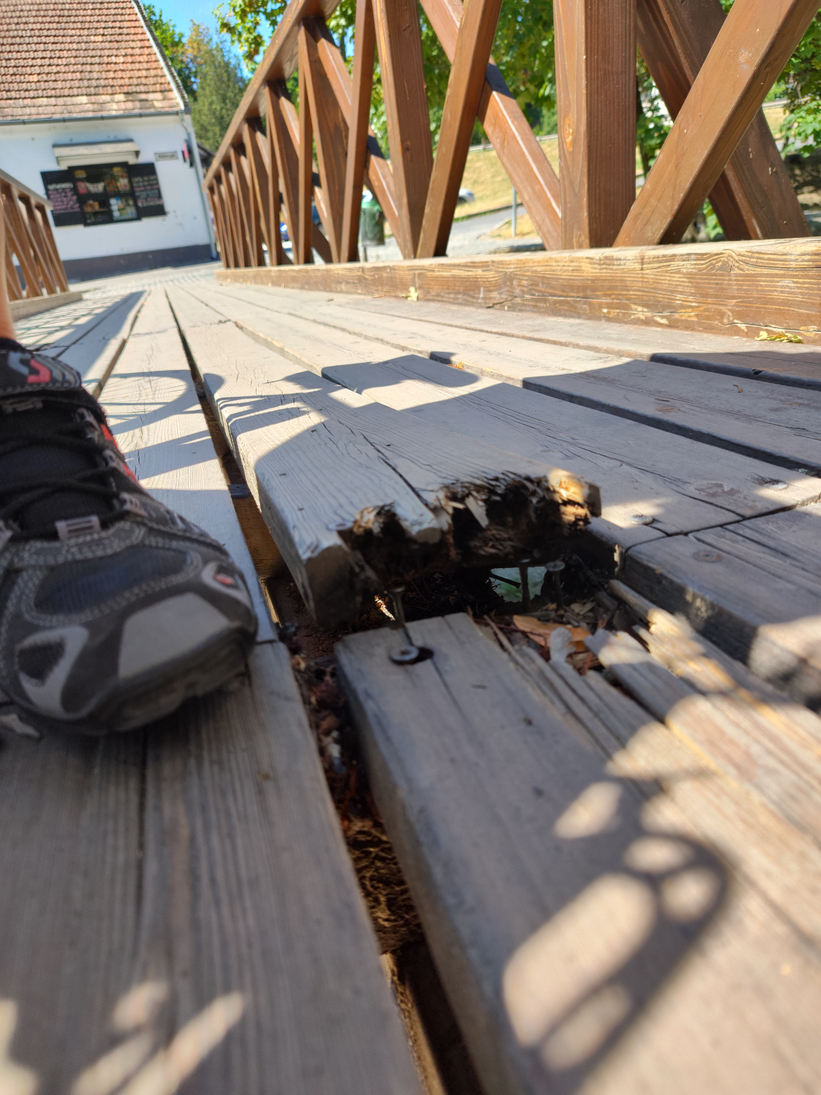 Szentendrén a Bükkös parti híd járófelületén kiálnak a csavarok sok helyen és el van korhadva plussz hajolva a jarófelületen a pallók ezáltal szintkülönbség van nagyon sok ahogy a képeken is látszik, balesetveszélyes ha belelép az ember.