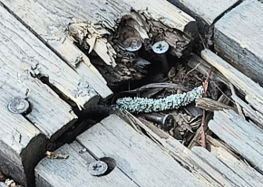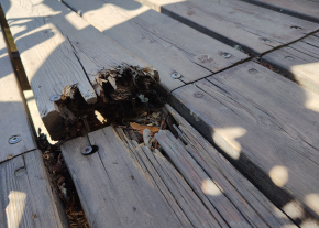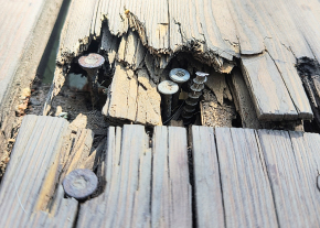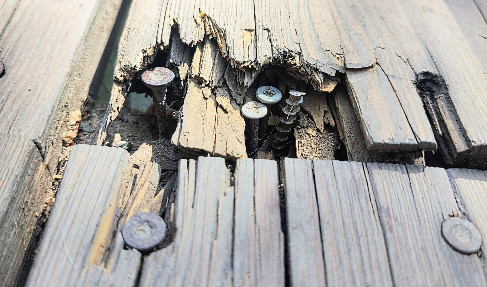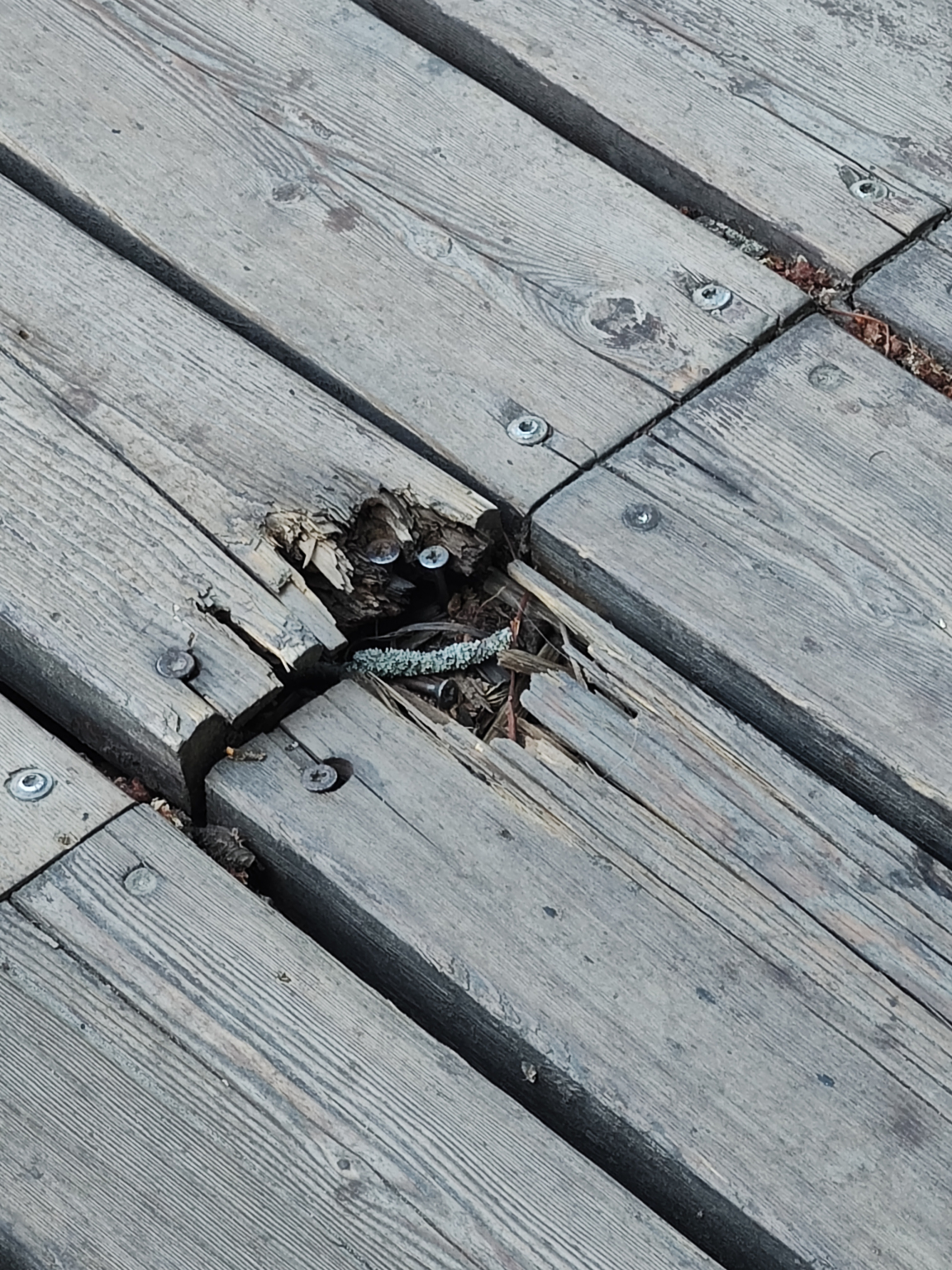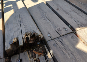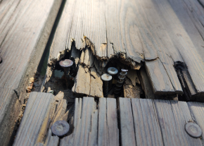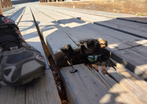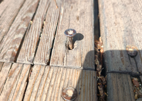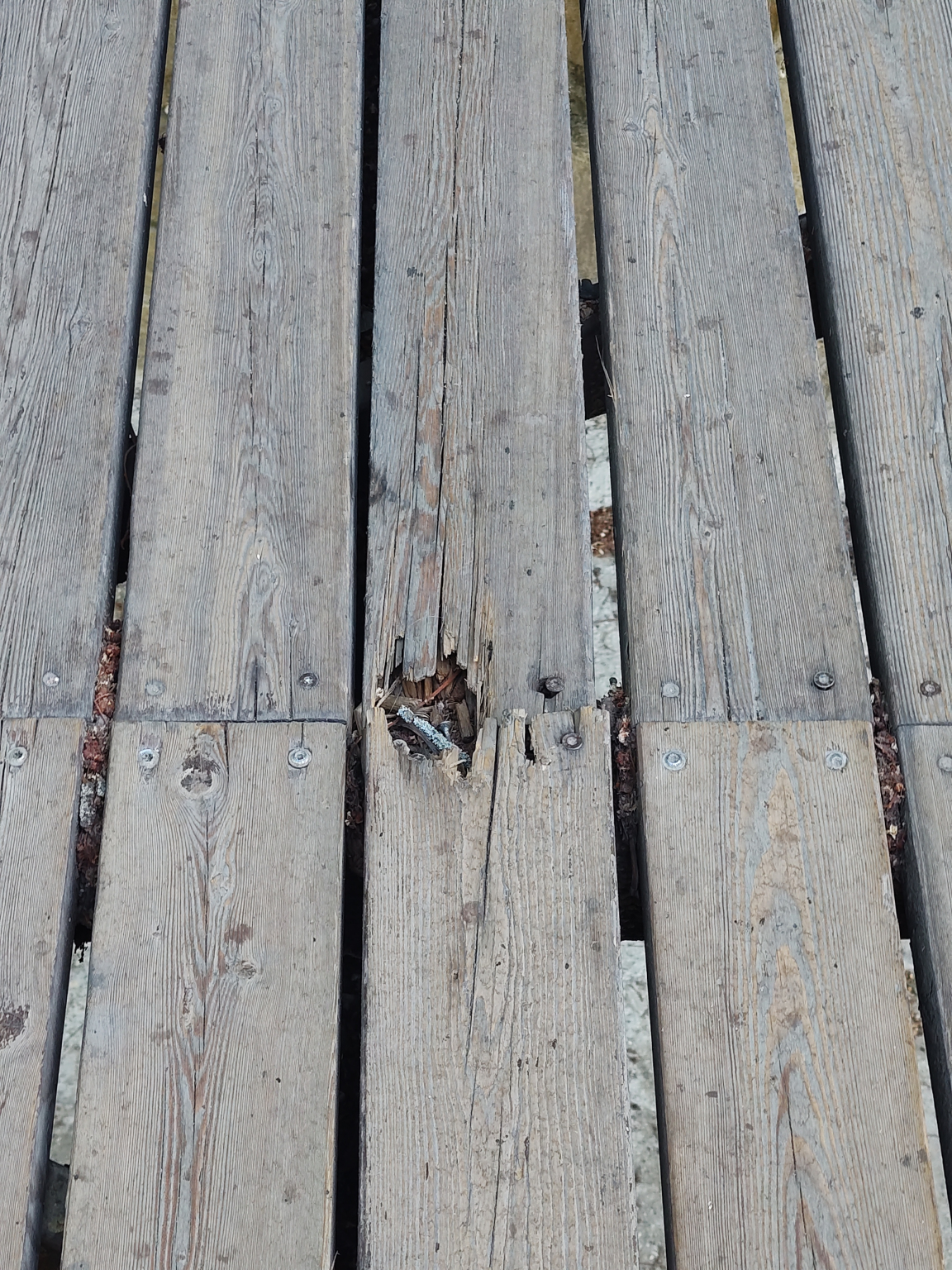 Szentendrén a Bükkös parti híd járófelületén kiálnak a csavarok sok helyen és el van korhadva plussz hajolva a jarófelületen a pallók ezáltal szintkülönbség van nagyon sok ahogy a képeken is látszik, balesetveszélyes ha belelép az ember.