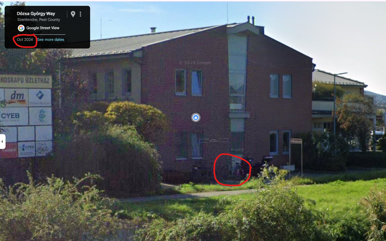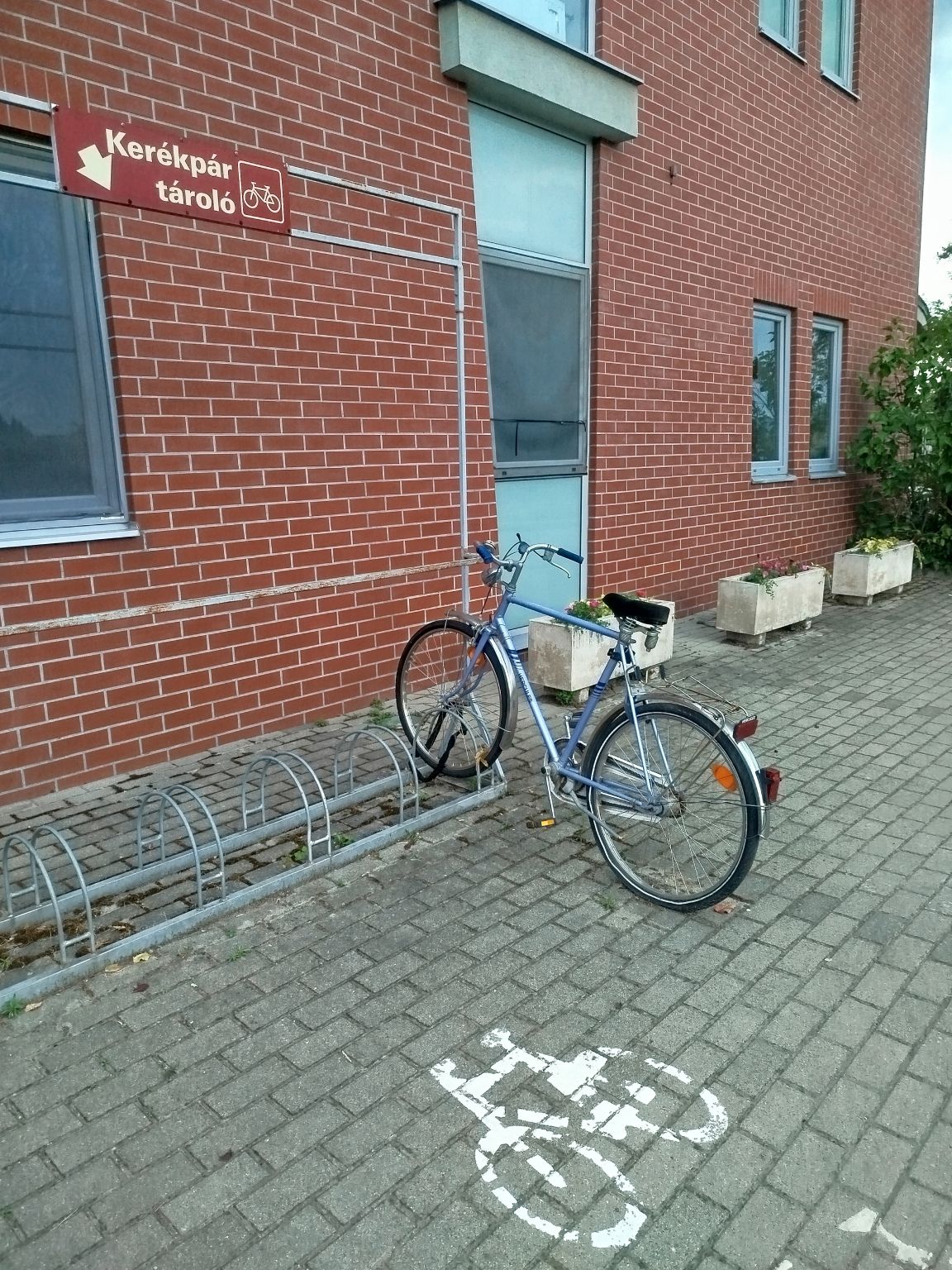 Városkapu Üzletháznál a tárolóban egy kerékpár feltehetőleg régebbóta, defektes, használaton kívülinek tűnő.
