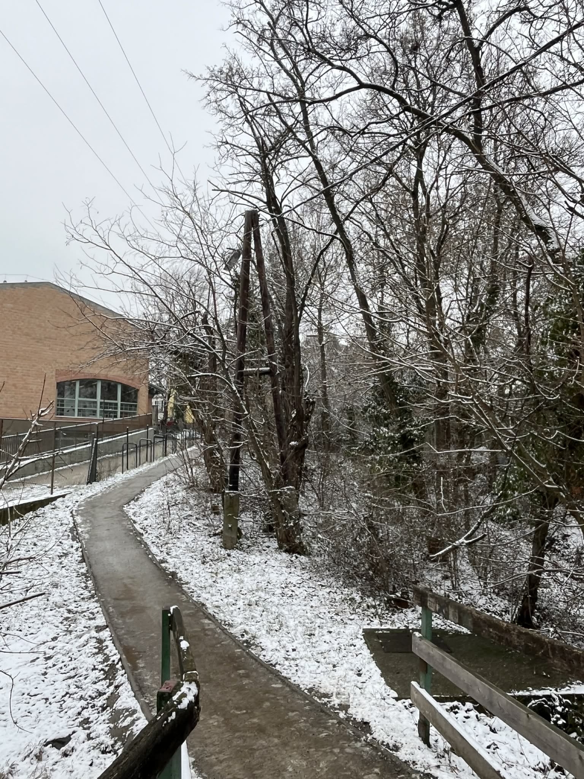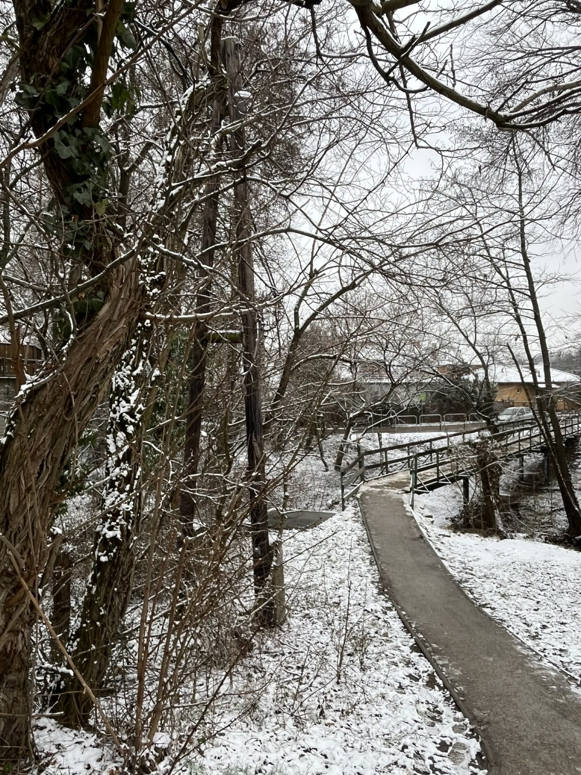 Az izbégi iskolánál lévő gyalogos fahídnál az iskola felőli oldalon található kandeláberen a lámpa nem világít és a növényzet is teljesen körbenőtte.
