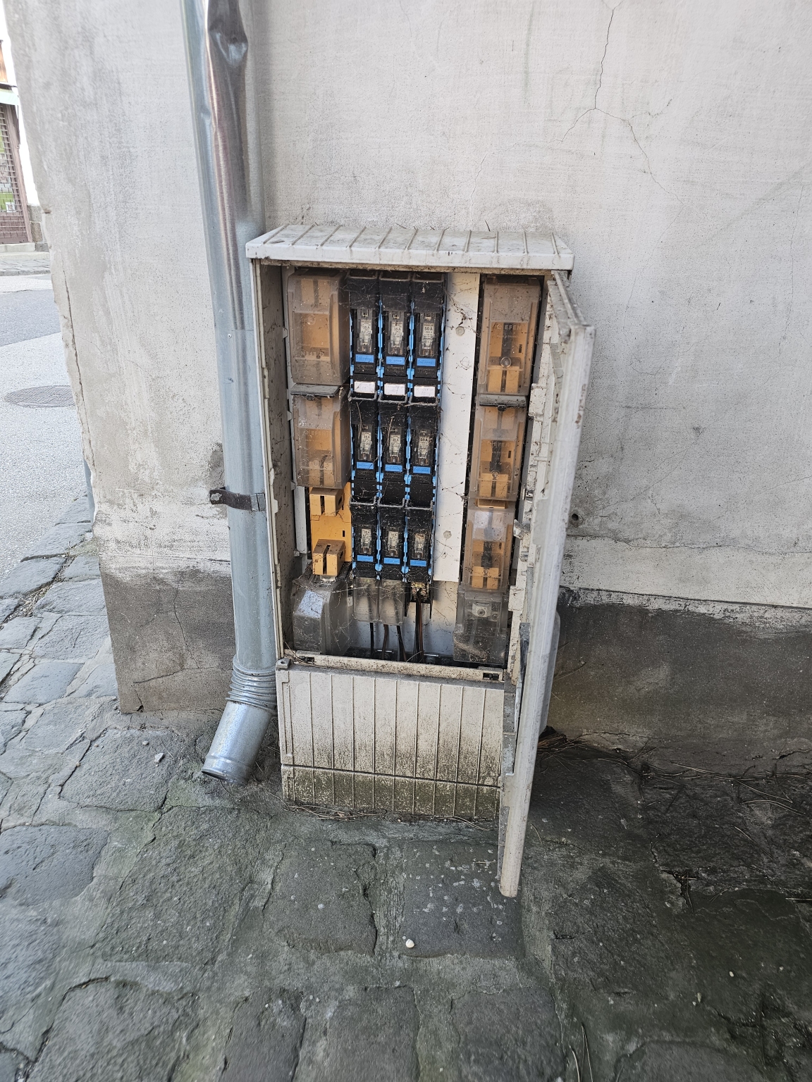 Kapcsolószekrény ajtaja tárva-nyitva. a feltüntetett telefonszámon "előfizető nem kapcsolható".