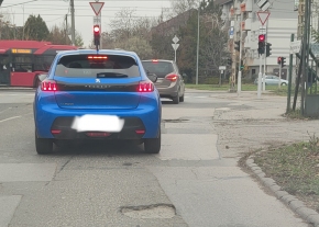 Csőtörés után a Vizműnek hetek óta nincs ideje betömni a képen látható kátyút Szentedre Barackos úton. És még a út lezáró deszkájukat is ott hagyták .