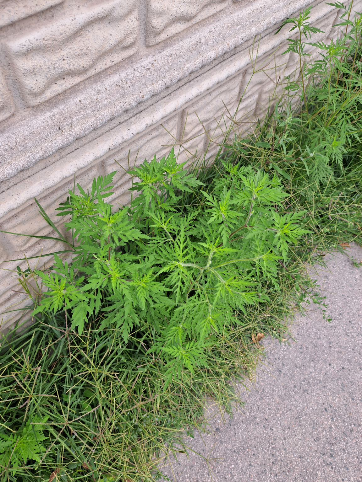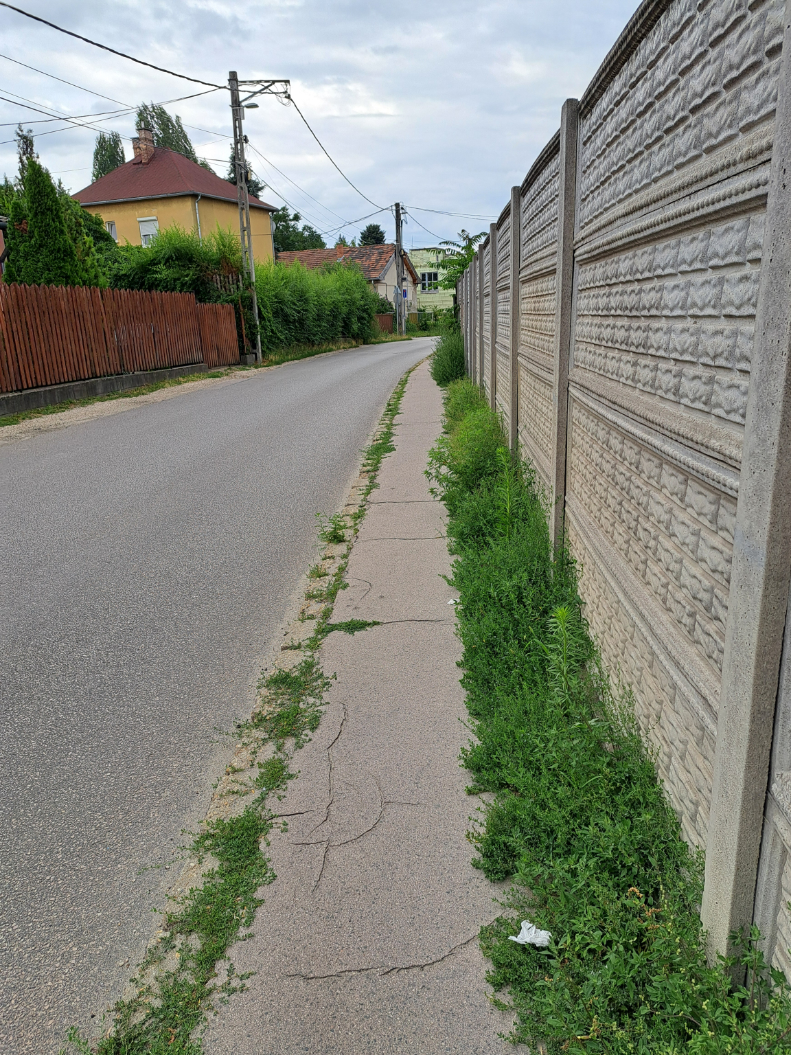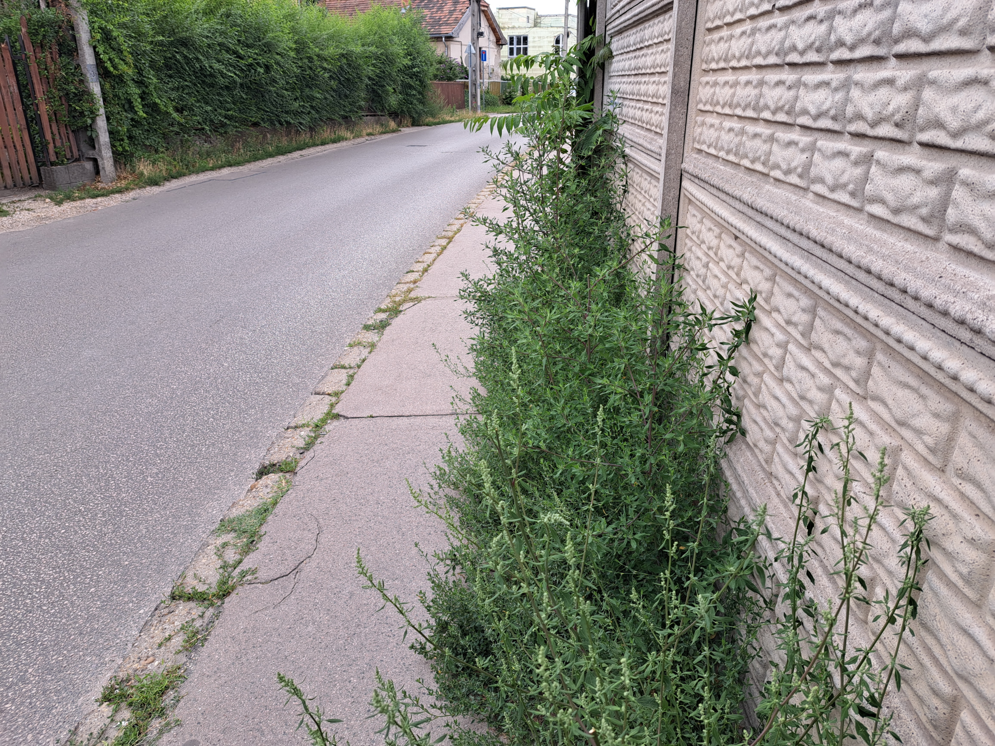 A járda nagy részét elfoglalva virágzik a parlagfű