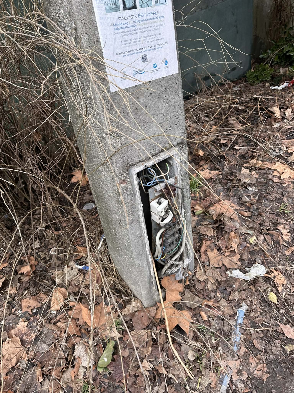 A képen látható villanyoszlopon az ajtó hiányzik, a vezetékek mindenki számára hozzáférhetők. Veszélyes, mert éppen a Kardos István Iskolával szemben van!