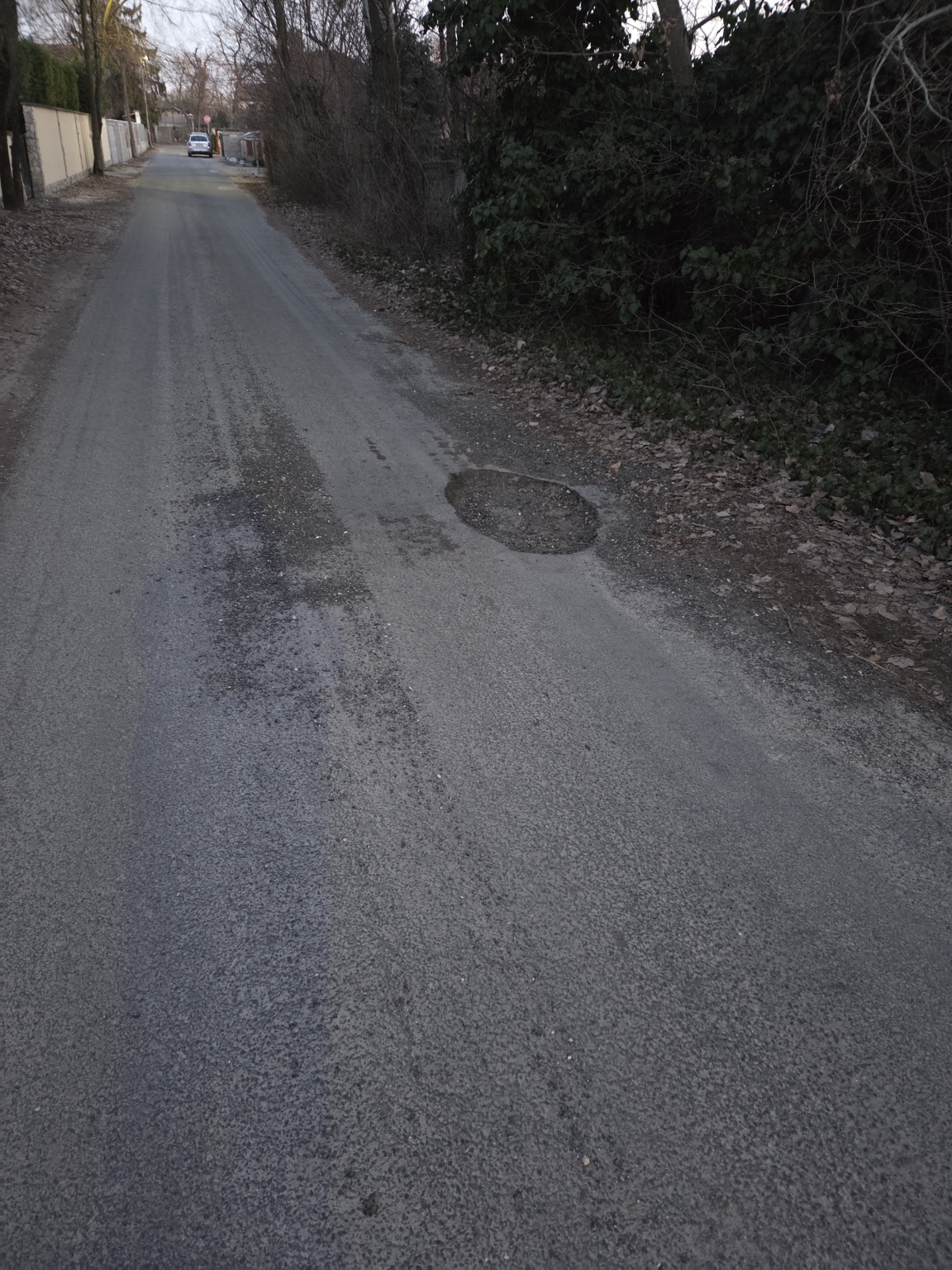 Szigetszentmiklós Kazal utcában a 6-os házszám előtt mély és nagy sugarú kátyu keletkezett