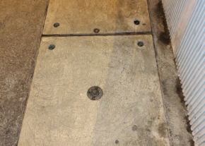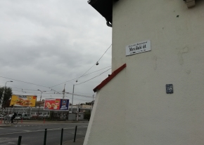 Kidőlt poller/térelválasztó korlát és utcanévtábla