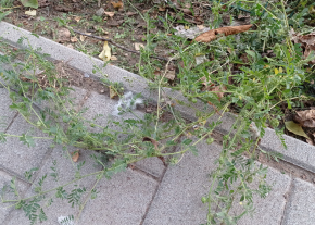 Járdára nőtt gyomnövény és járdára belógó akácfa