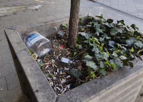 Üvegszilánkok, üvegtörmelék a járda közepén.