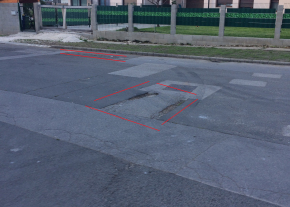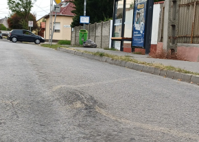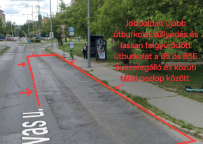 Újabb jobboldalt süllyedő útburkolat, felgyürödőtt buszmegálló