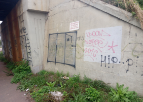 Egy nagyon koszos és graffitis vasúti felüljáró