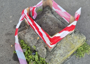 Hiányzik pár kockakő a járdán, és egy fém darab áll ki a helyükről. Valószínűleg a mekihez tartozik a terület.