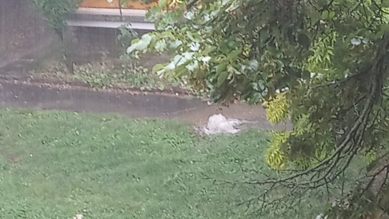 Nagy eső után szökőkútszerűen feltörő, folyamatosan zubogó víz a járda mellett. A víz alámossa a járdát.