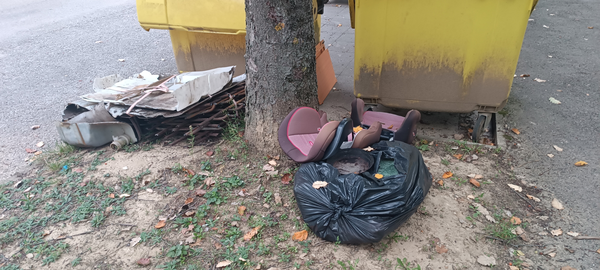 Veszprém Kalmár tér 26-28. szám közötti útszakasz mellé kihelyezett szelektív hulladékgyűjtők közelében lerakott lom, hulladék.