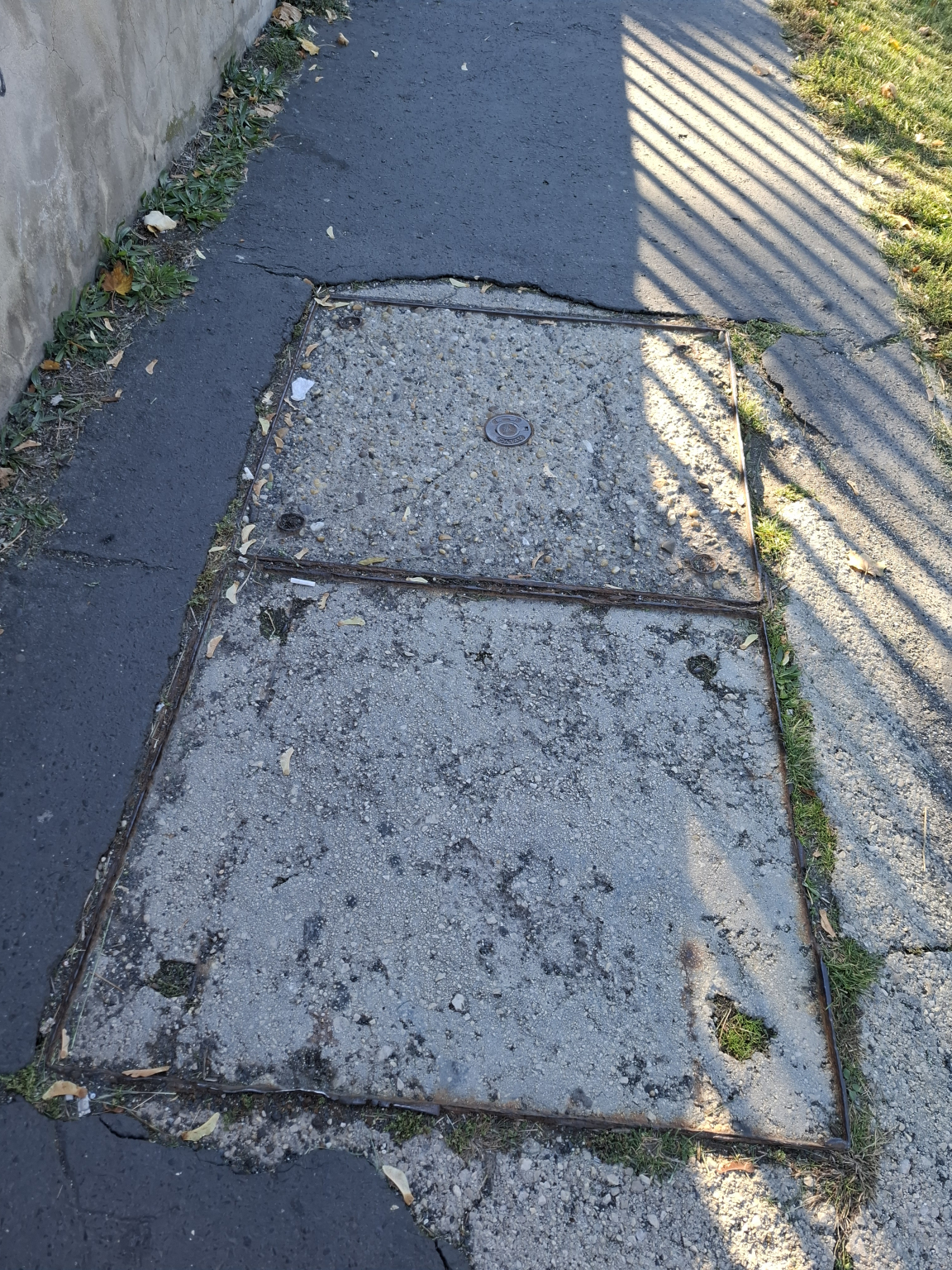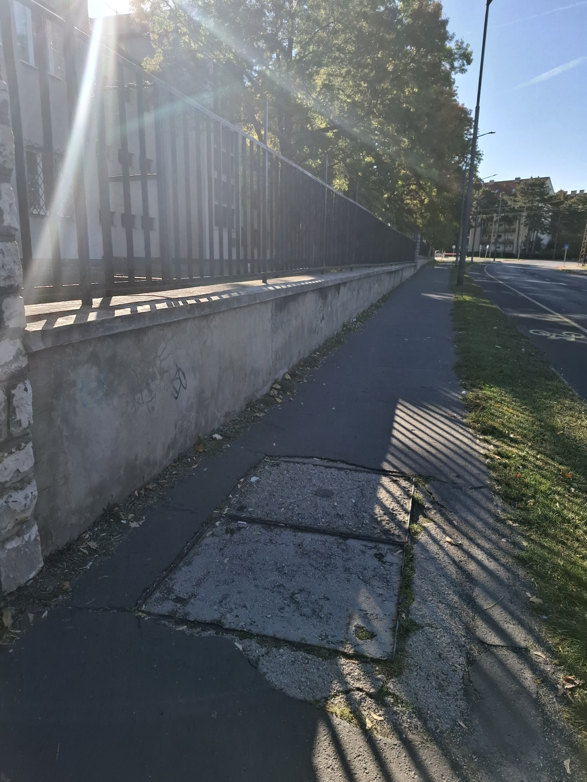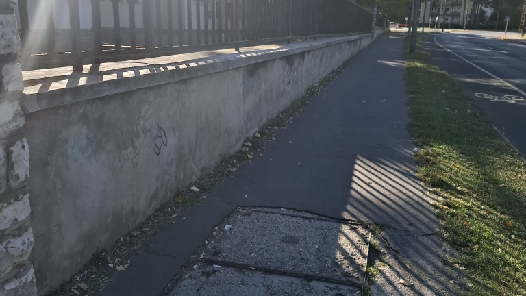 A laktanya előtt a fedlapok fém széle botlásveszélyes, a beton morzsolódik szét a fedlapban.