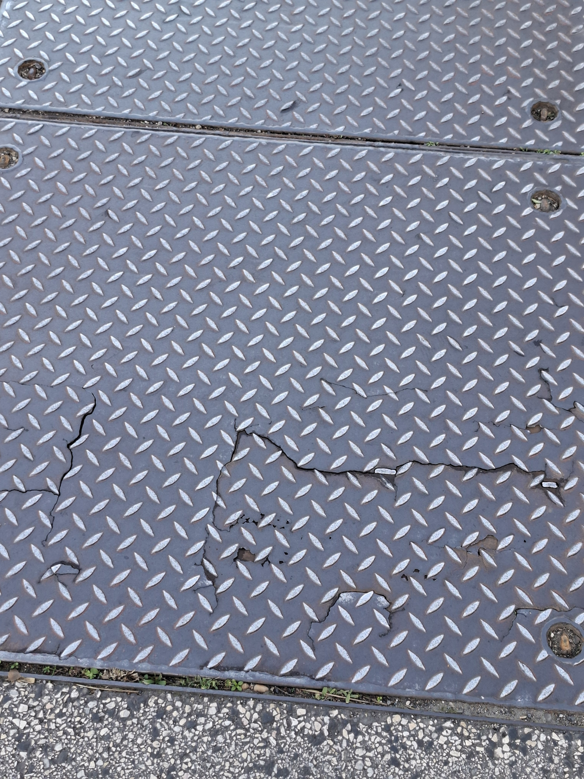 A Jutasi út és a Töeök Ignác út kereszteződésében az úttesten lévő fém fedlap két helyen is megrepedt. Balesetveszélyes.