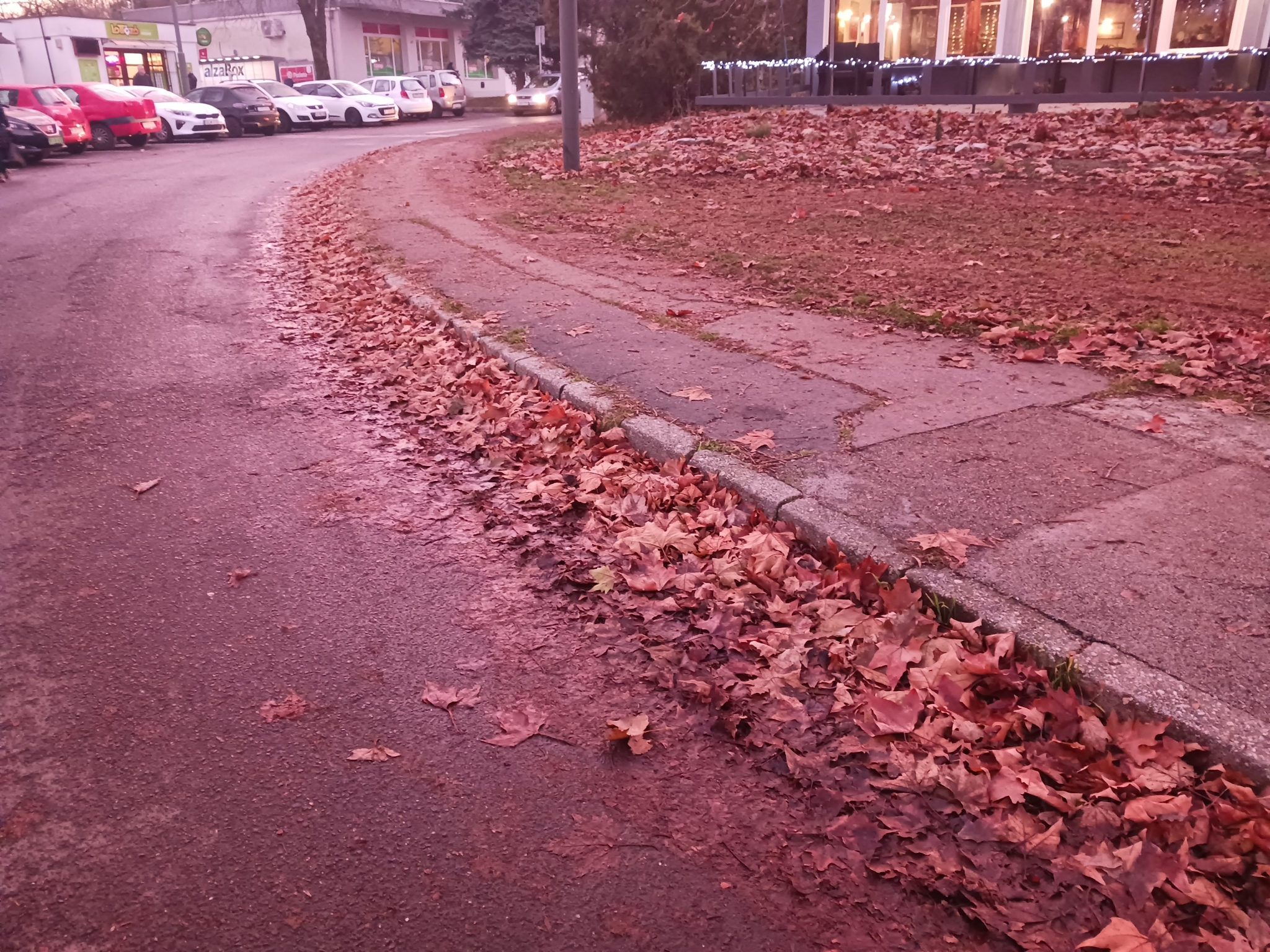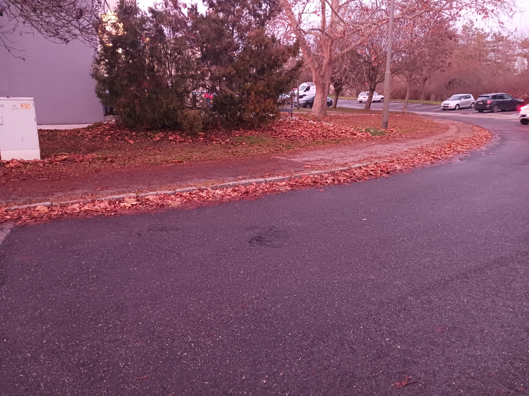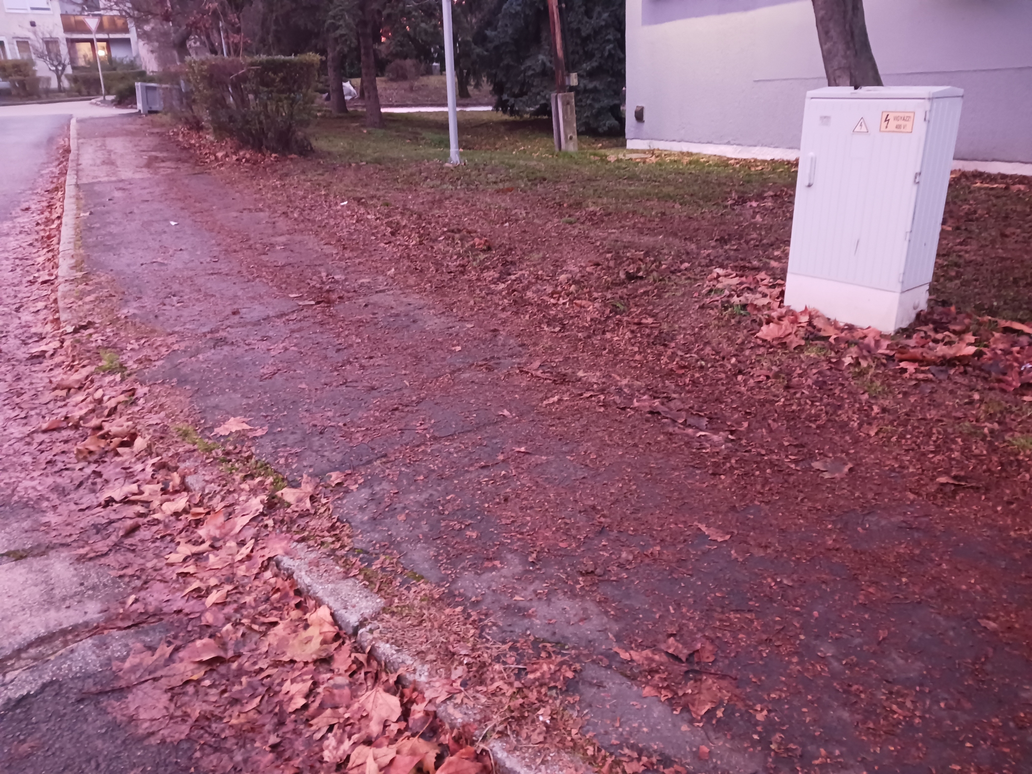 A veszprémi VKSZ megint brillírozott, nedves sáros időben "füvet nyírt", aprította az avart, ennek eredményeként több helyen összesározott járda, levéltörmelékkel vastagon borított terület maradt hátra. Ez nemcsak bosszúságot okoz - az ember behordja a talpán a házakba - hanem balesetveszélyes is ha valaki elcsúszik rajta. A fűnyírós ember által beígért takarítás persze elmaradt. A fényképeken látszik, hogy a járdaszegély mellett vastagon falevél van, mintha ez a terület - az Endrődi Sándor utcai nagy parkoló, Sirály étterem előtti rész - nem tartozna a hatáskörükbe.